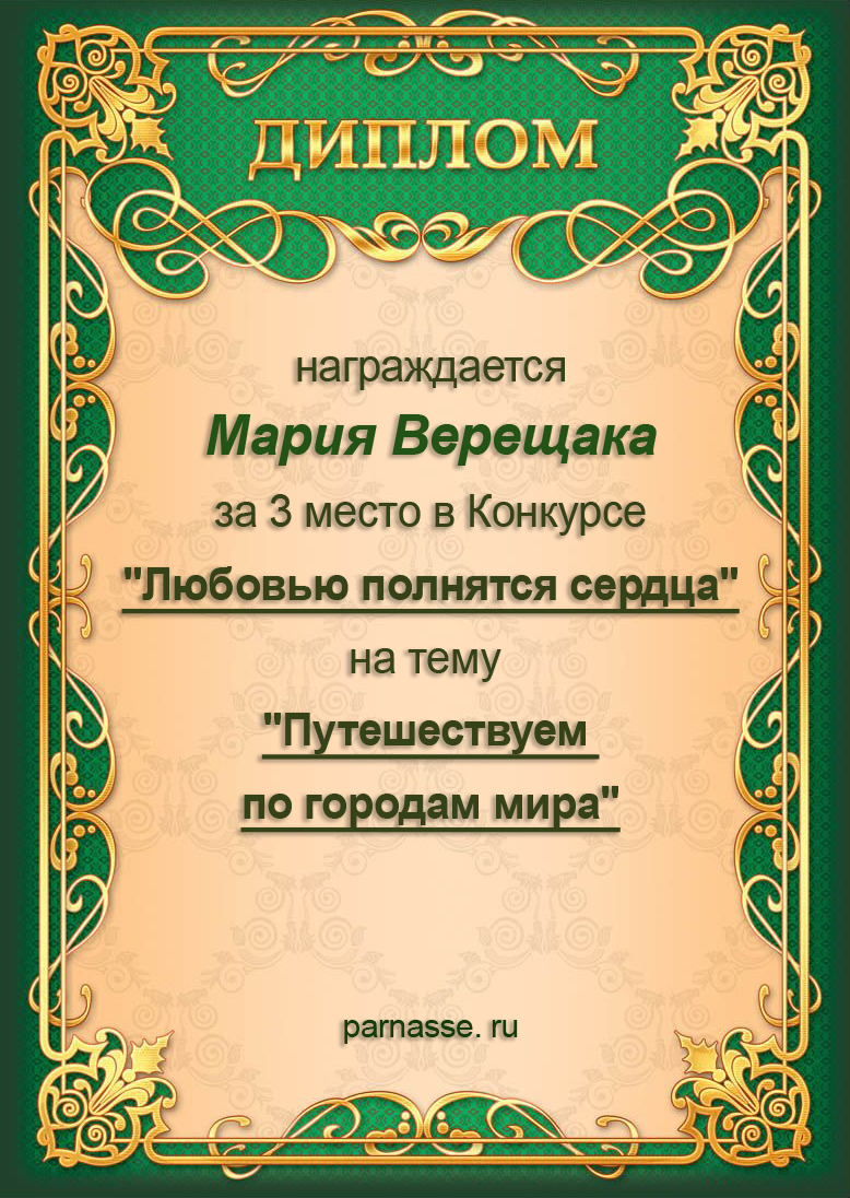 За 3 место в Конкурсе "Любовью полнятся сердца" на тему "Путешествуем по городам мира".