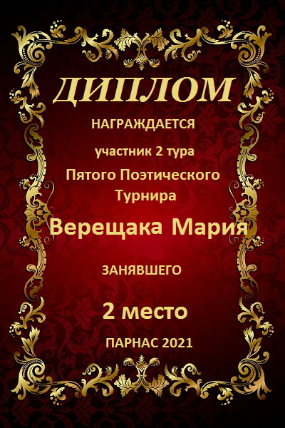 Второе место в судейском голосовании по итогам 2 - го тура Пятого Поэтического Турнира