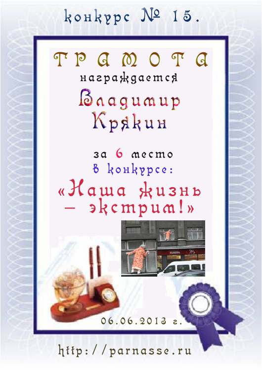 Грамота за 6 место в 15 конкурсе "Наша жизнь - экстрим"