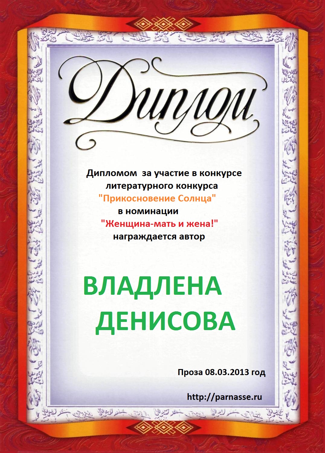 Третье место в музыкально-литературном конкурсе «ЗИМНЯЯ СКАЗКА», в прозаической номинации «Зима и Любовь»! Произведение «ВСТРЕЧА НОВОГО ГОДА»! Поздравляем с блестящей победой в конкурсе, Владлена!