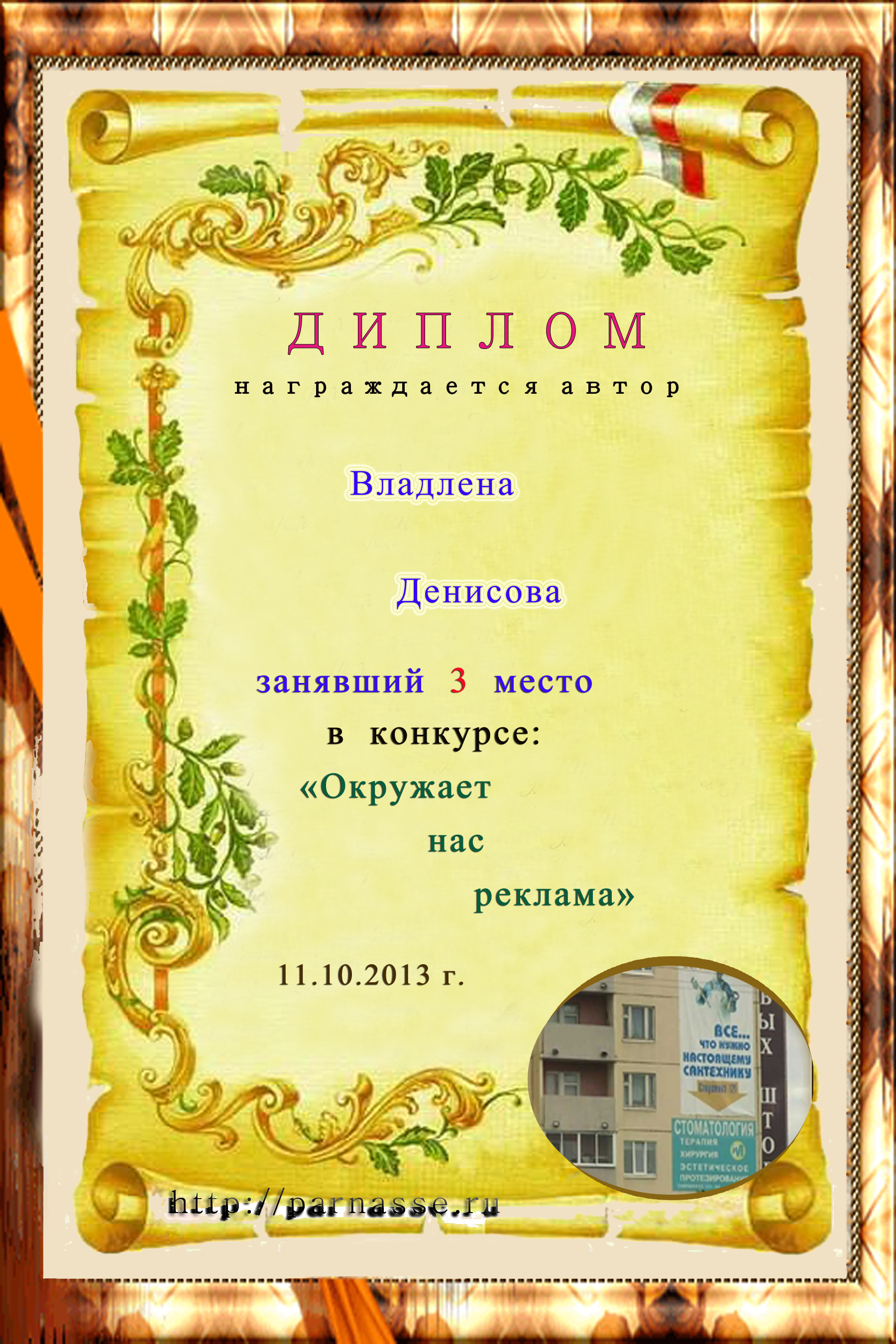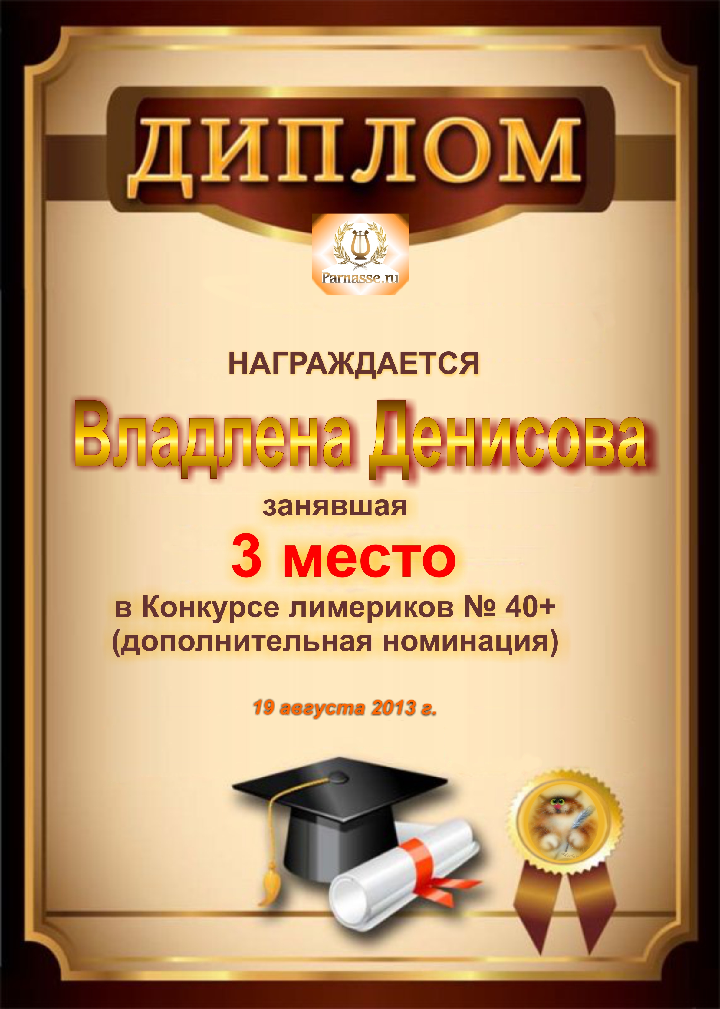 Диплом за победу и 3 место в дополнительной номинации конкурса лимериков № 40+ (19.08.2013 г.)