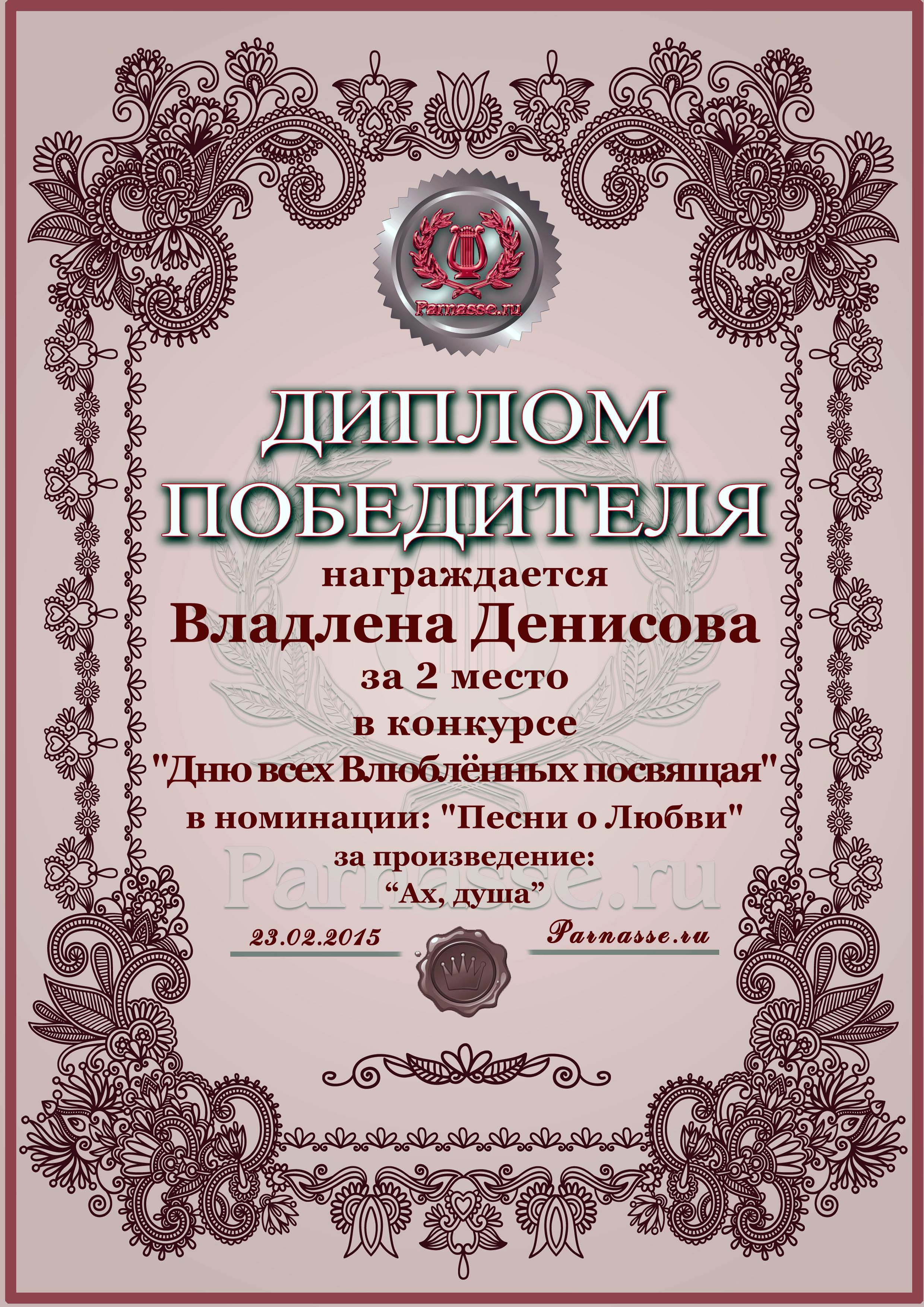 Второе место в конкурсе "Дню всех Влюблённых посвящая", песенная номинация, судейское голосование, автор слов песни "Ах, душа". Поздравляем!