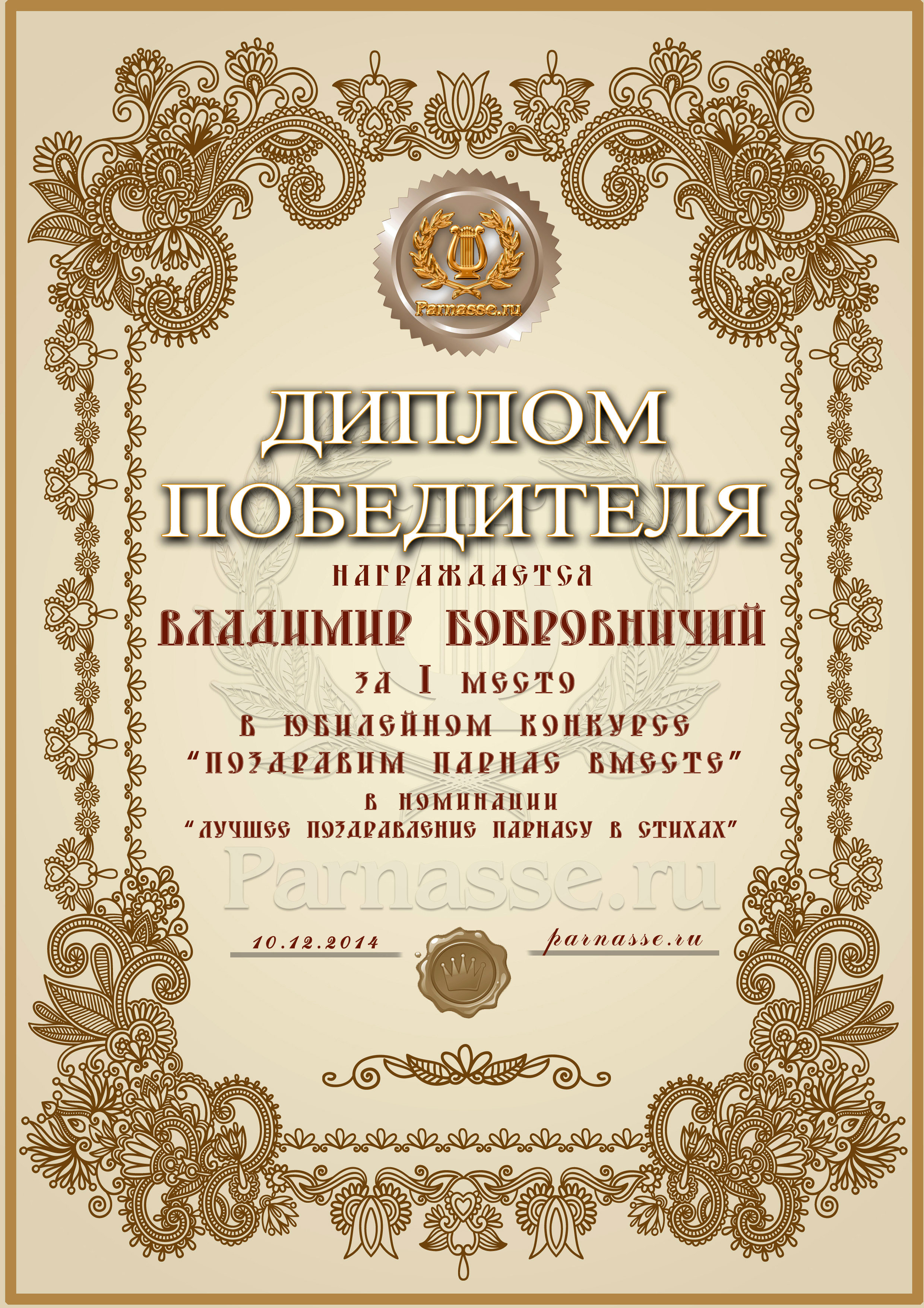 Первое место в праздничном конкурсе "ПОЗДРАВИМ ПАРНАС ВМЕСТЕ!", в номинации "Лучшее стихотворное поздравление Парнасу". Позвольте от всей души выразить Вам благодарность за прекрасные поэтические слова поддержки, самые тёплые пожелания нашему Парнасу и пожелать Вам новых побед на литературном поприще, успехов в жизни и всех Ваших начинаниях! Будьте счастливы, здоровы, пусть удача не покидает Вас ни на минуту и от всей души СПАСИБО! Оставайтесь с нами и мы будем вновь и вновь встречать Дни рождения "Парнаса" в одной дружной, душевной компании! Произведение "Путь на Парнас"