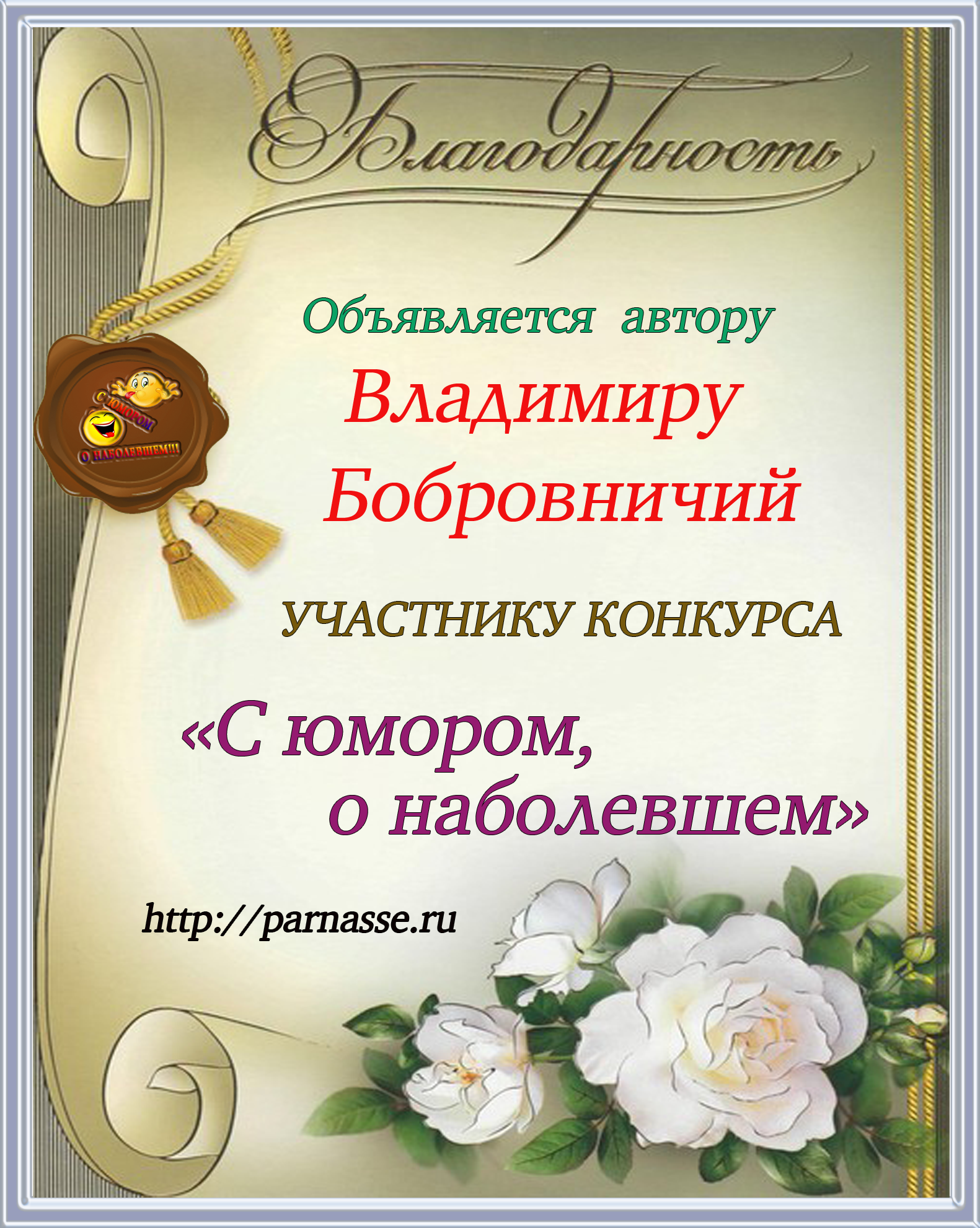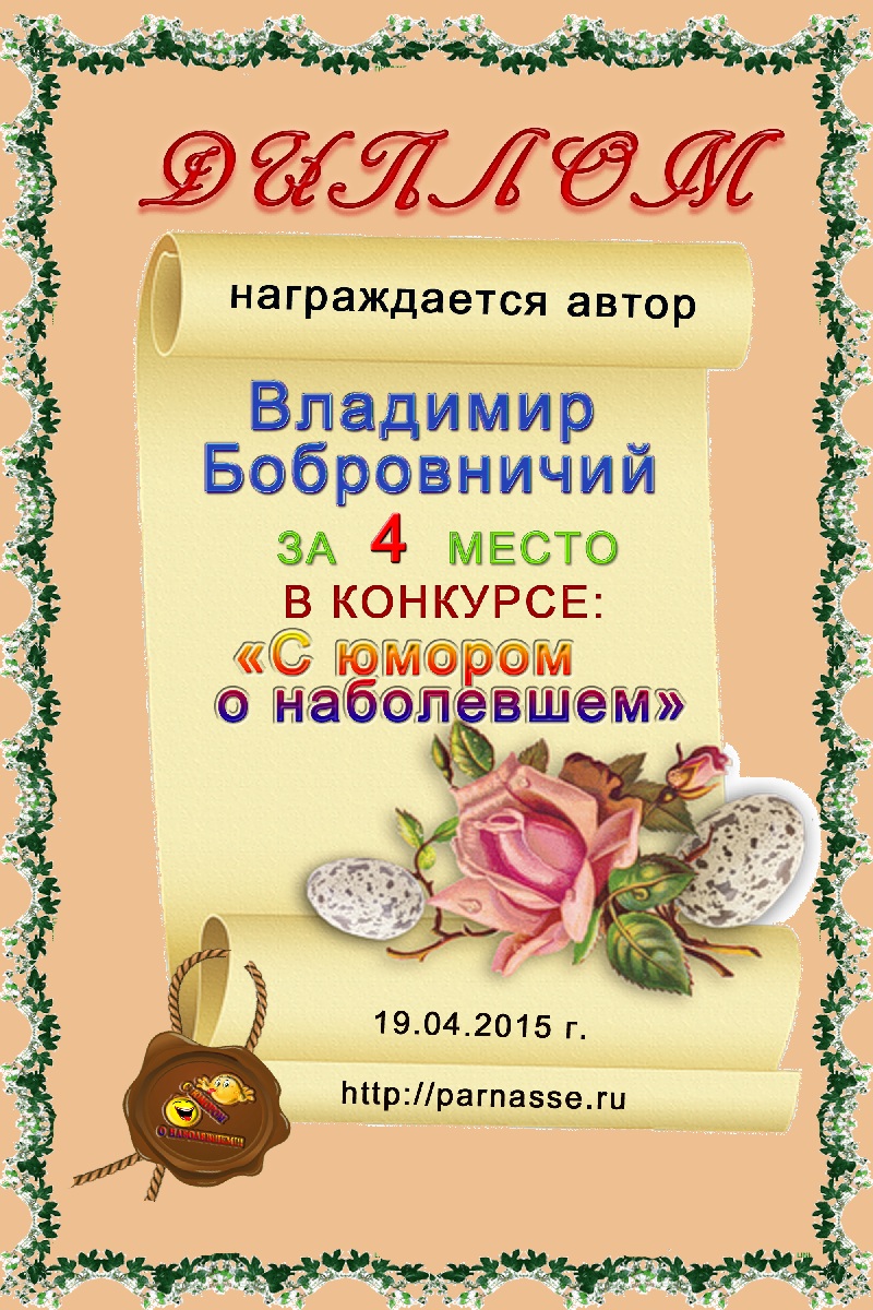 Первое место в праздничном конкурсе "ПОЗДРАВИМ ПАРНАС ВМЕСТЕ!", в номинации "Лучшее стихотворное поздравление Парнасу". Позвольте от всей души выразить Вам благодарность за прекрасные поэтические слова поддержки, самые тёплые пожелания нашему Парнасу и пожелать Вам новых побед на литературном поприще, успехов в жизни и всех Ваших начинаниях! Будьте счастливы, здоровы, пусть удача не покидает Вас ни на минуту и от всей души СПАСИБО! Оставайтесь с нами и мы будем вновь и вновь встречать Дни рождения "Парнаса" в одной дружной, душевной компании! Произведение "С Днём Рождения Парнас!"