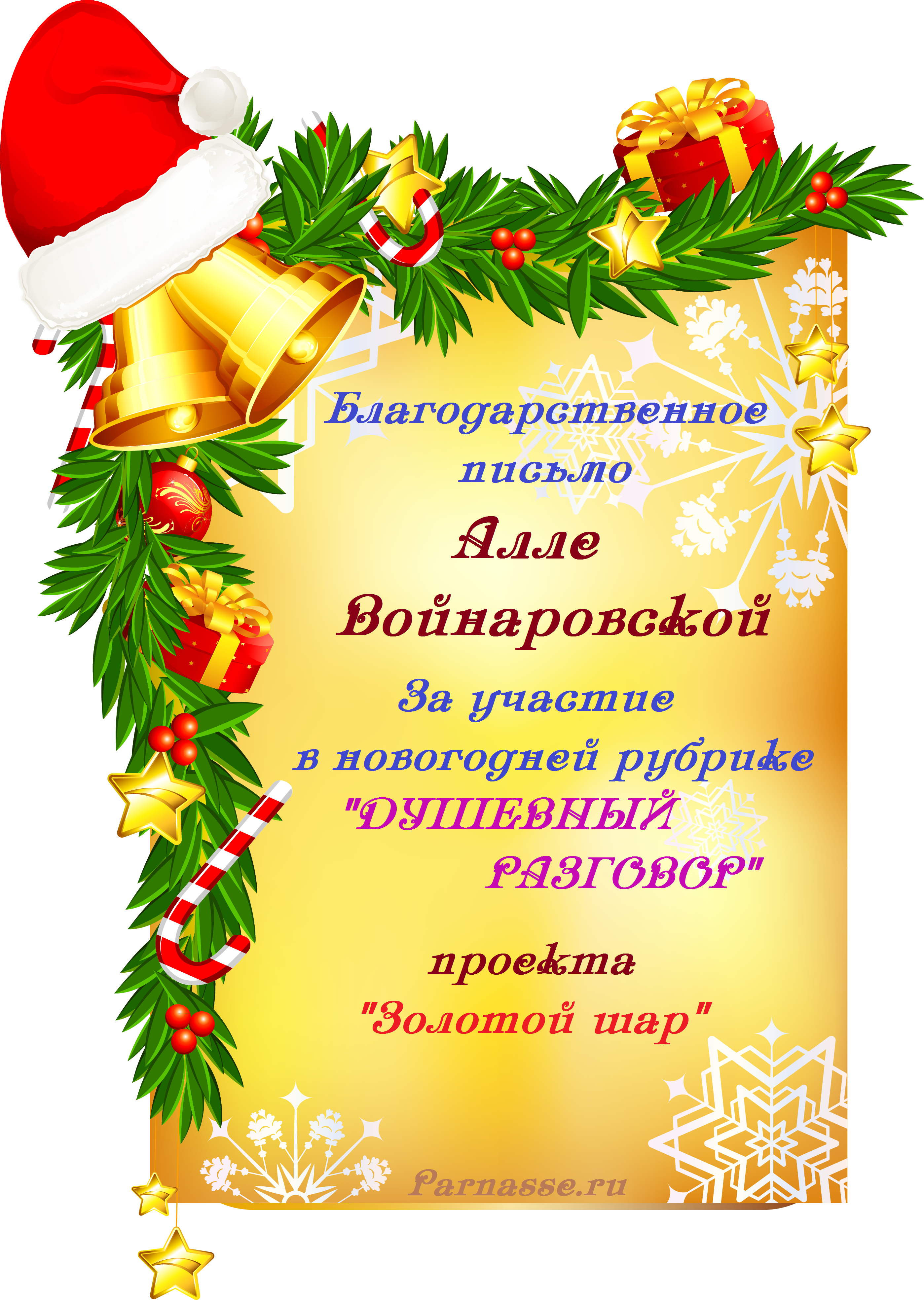 Похвальная Грамота за участие в Новогодних праздничных мероприятиях на проекте "ЗОЛОТОЙ ШАР"!Поздравляем!