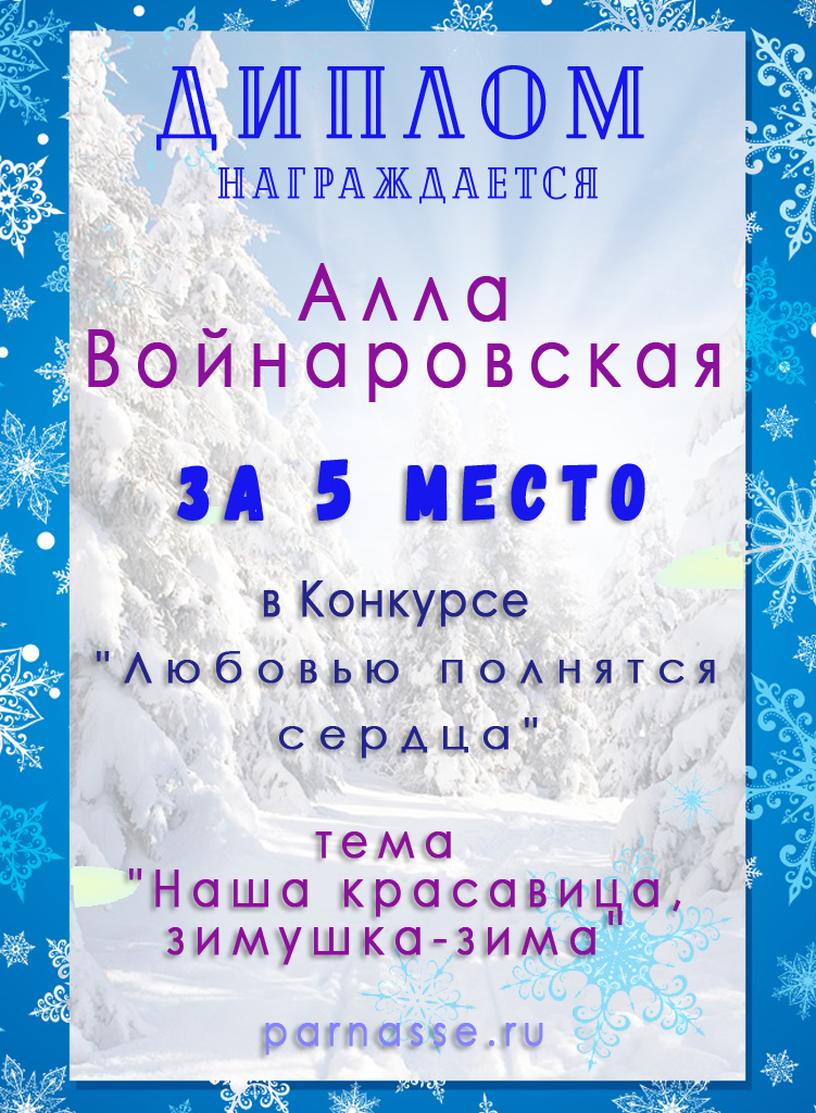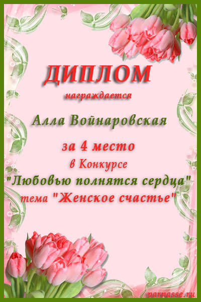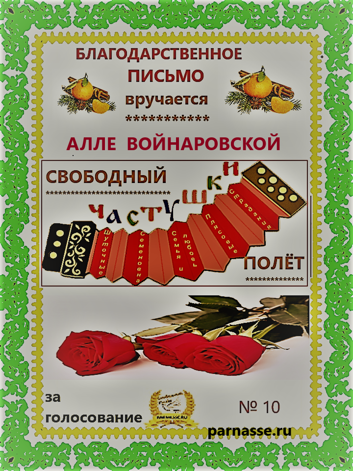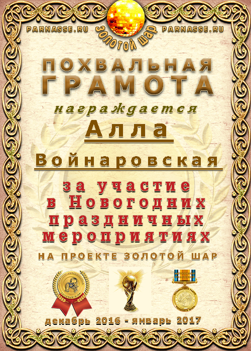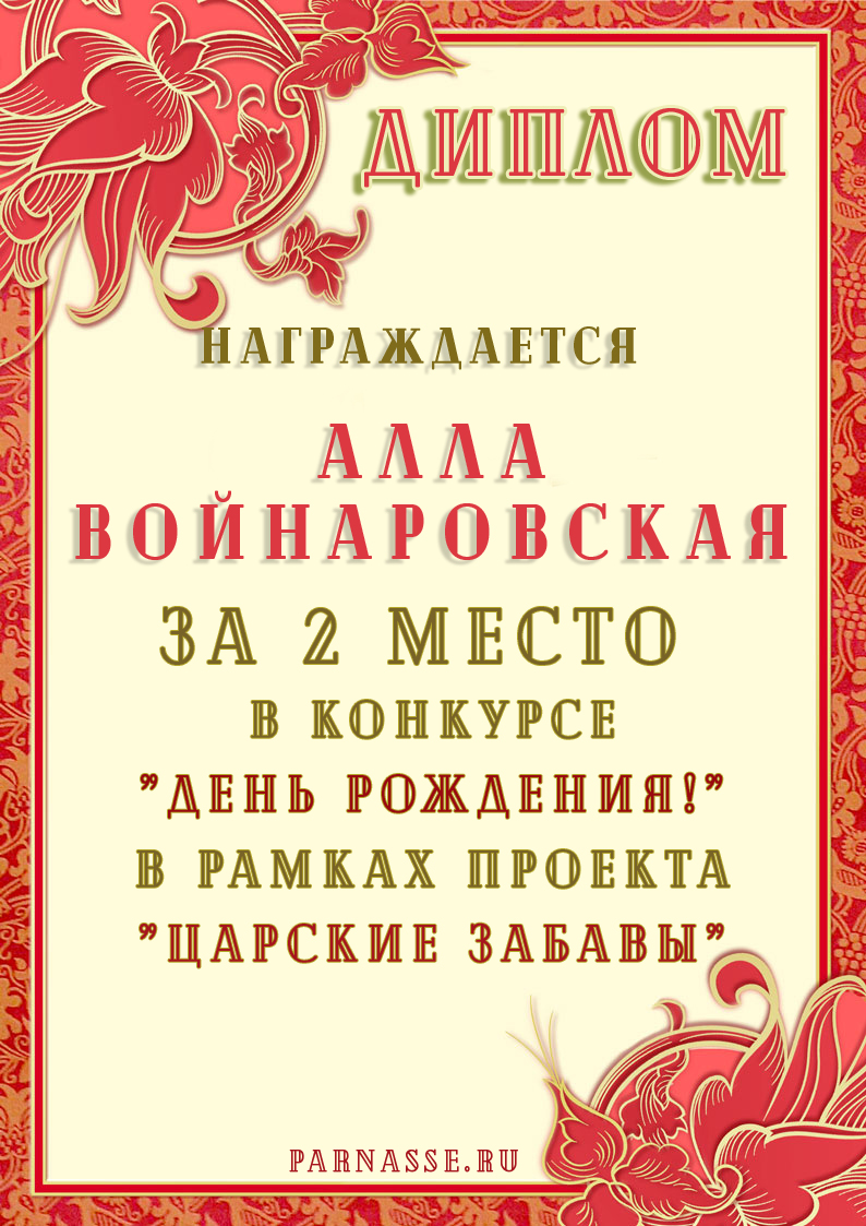 За неугасающую и неисчерпаемую творческую активность, постоянный контакт с Музой и признание сообществом "Парнасцев".От всей души желаем Вам, Алла, здоровья, любви, успехов, благополучия, удачи и творческого вдохновения!