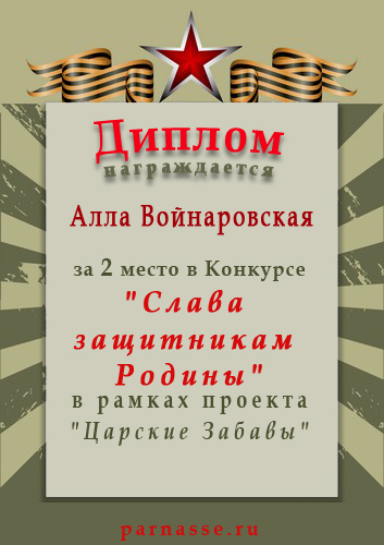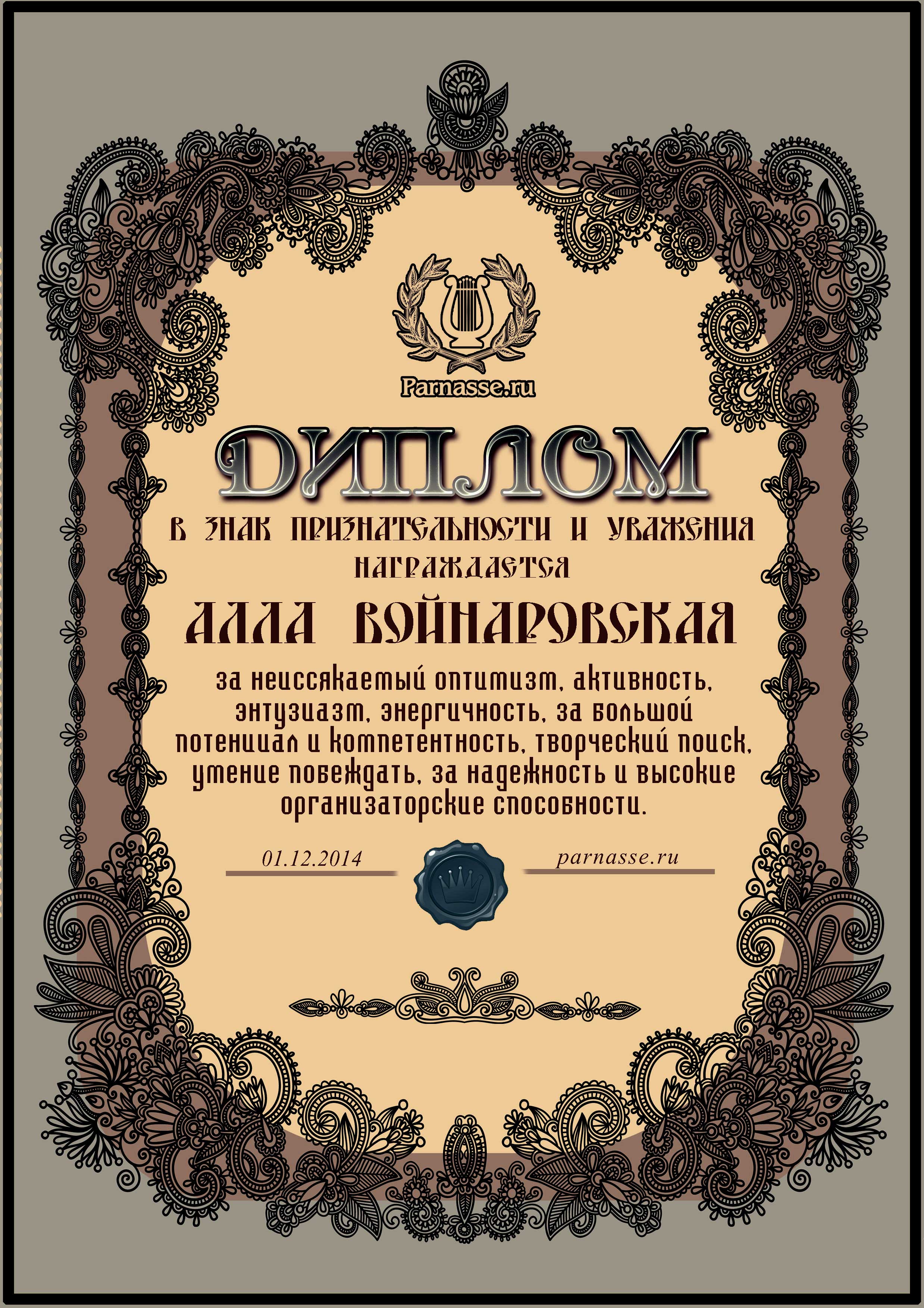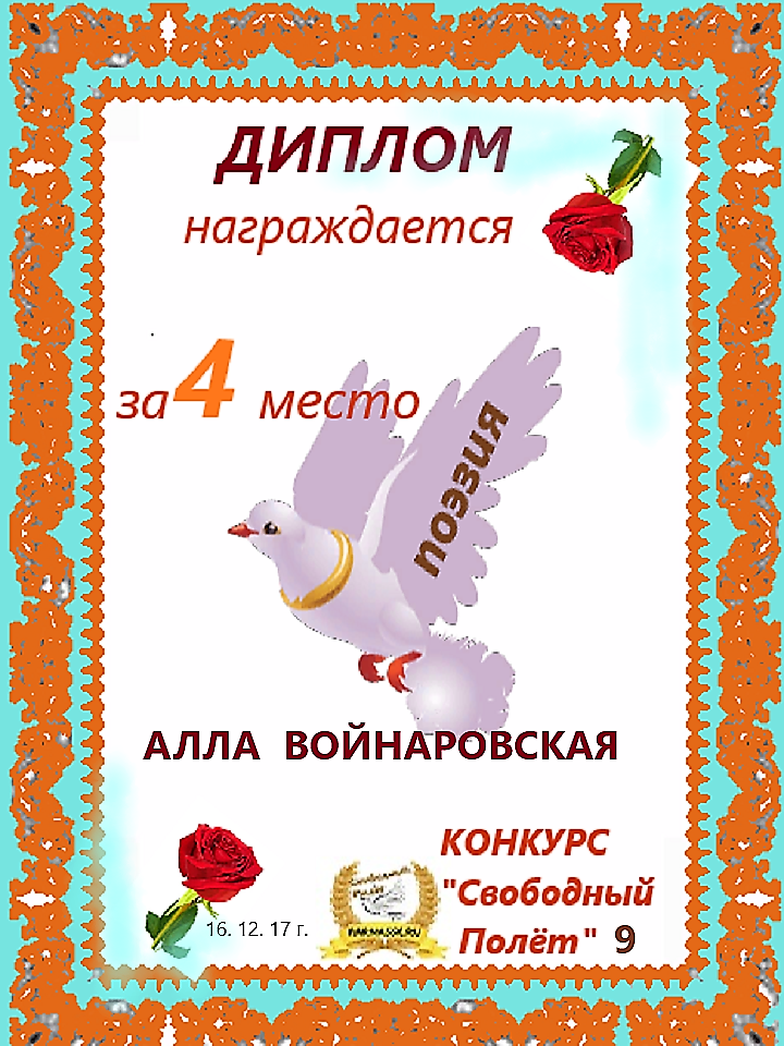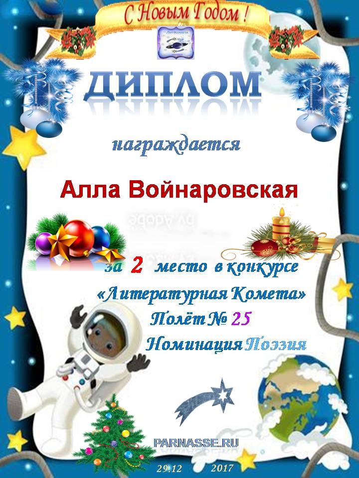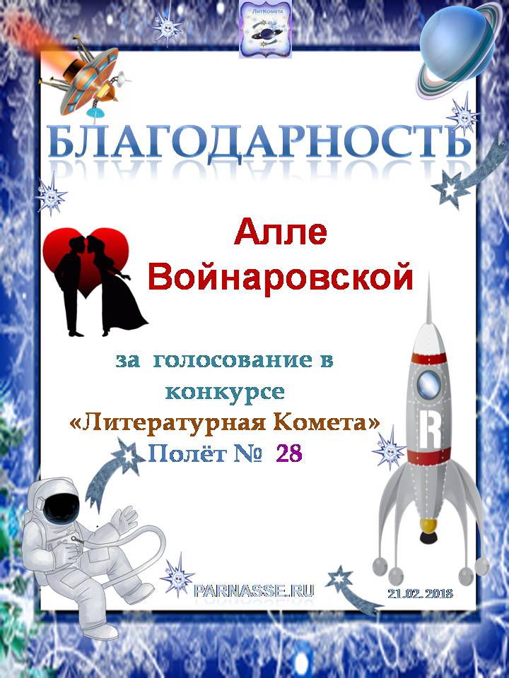 За неугасающую и неисчерпаемую творческую активность, постоянный контакт с Музой и признание сообществом "Парнасцев".От всей души желаем Вам, Алла, здоровья, любви, успехов, благополучия, удачи и творческого вдохновения!