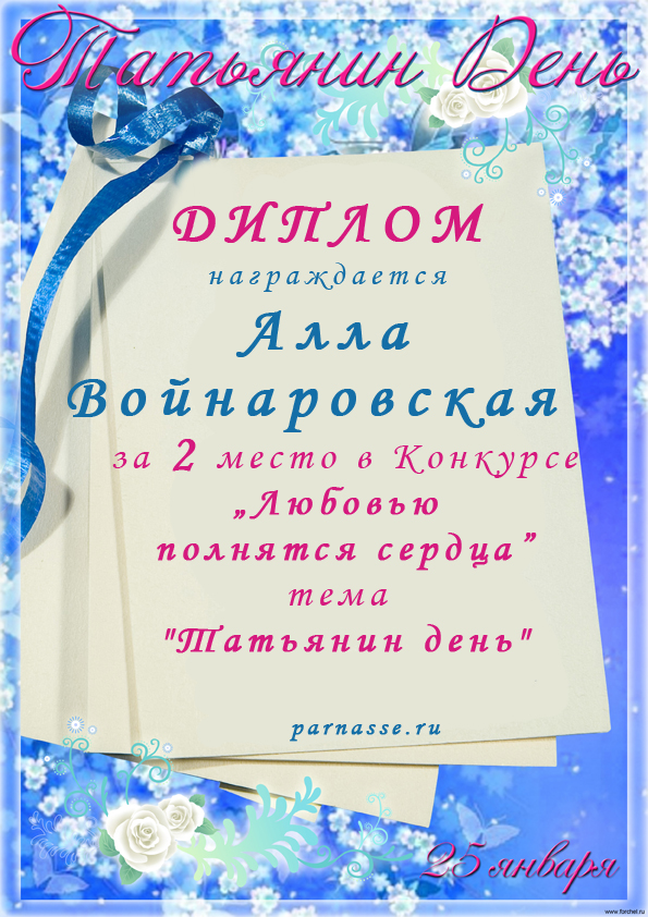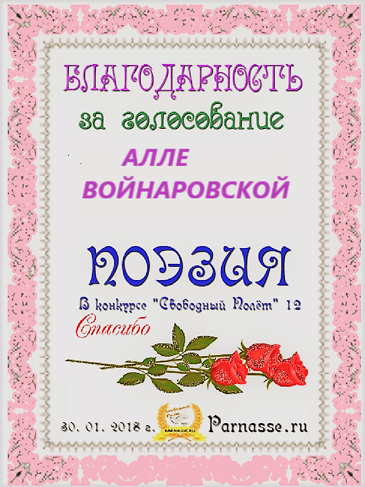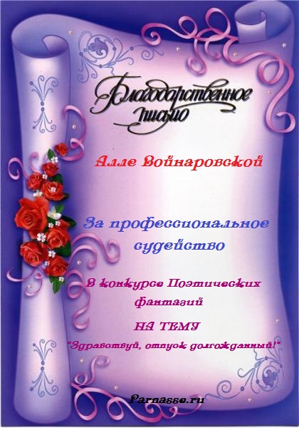 Уважаемая Алла!Спасибо Вам большое за высокопрофессиональное, объективное судейство конкурсов на Парнасе!