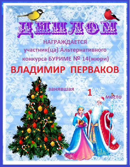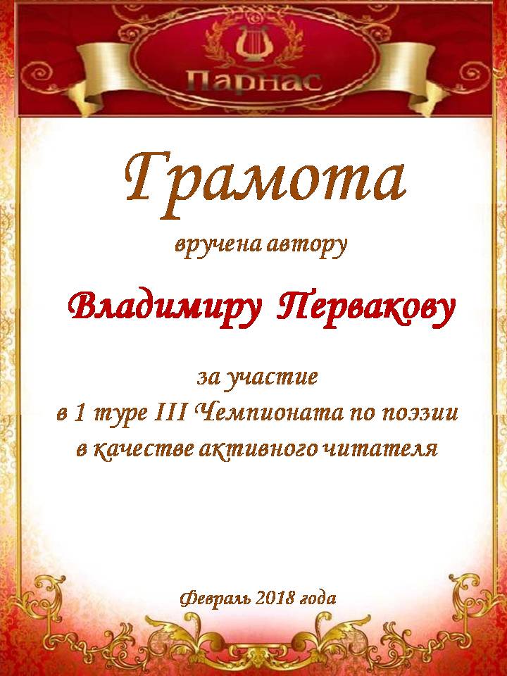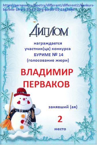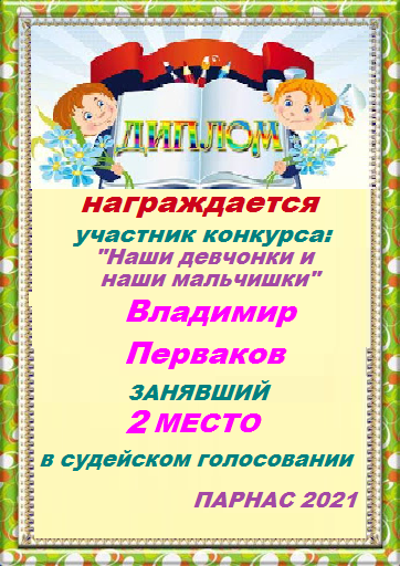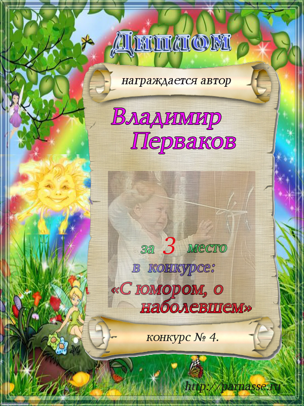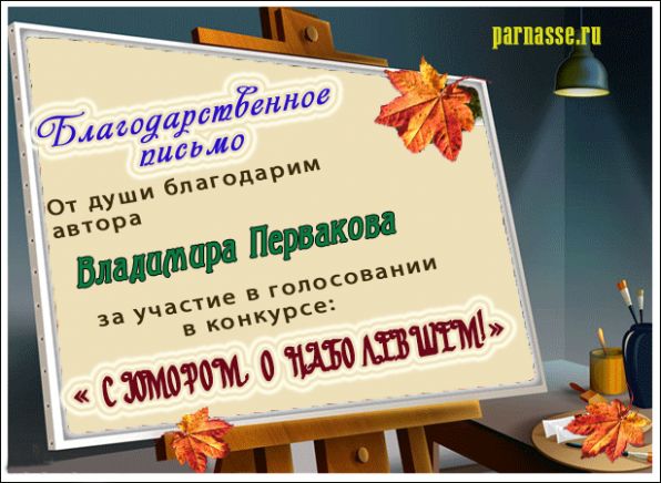 Номинация "Самое необычное поздравление Парнаса с Днём Рождения"Хочется выразить Вам, Владимир, огромнейшую благодарность за неординарное яркое поздравление! Мы благодарны Вам за, то, что именно "Парнас" стал для Вас теплым и дружеским домом, кругом друзей, помощником в публикации своих замечательных произведений в Интернете!