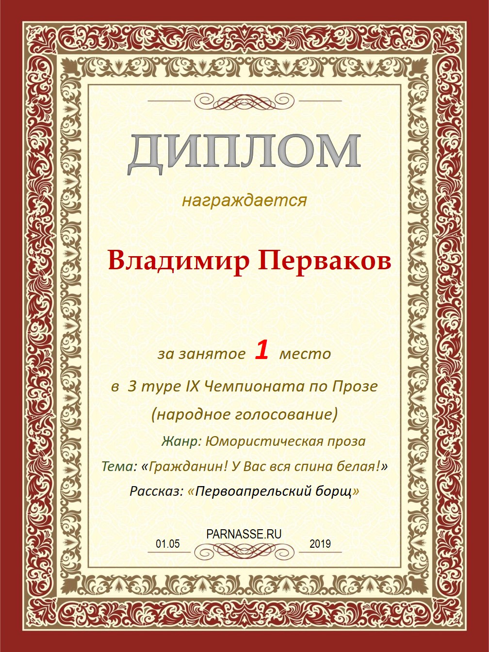 Поздравляю с занятым 1 местом в 8 туре IX Чемпионата Парнаса по Прозе (народное голосование)!