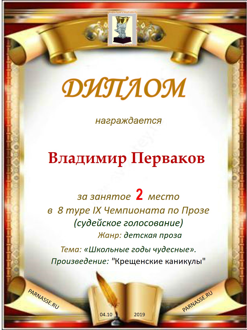 Поздравляю с занятым 2 местом в X Чемпионате Парнаса по Прозе - 7 тур!