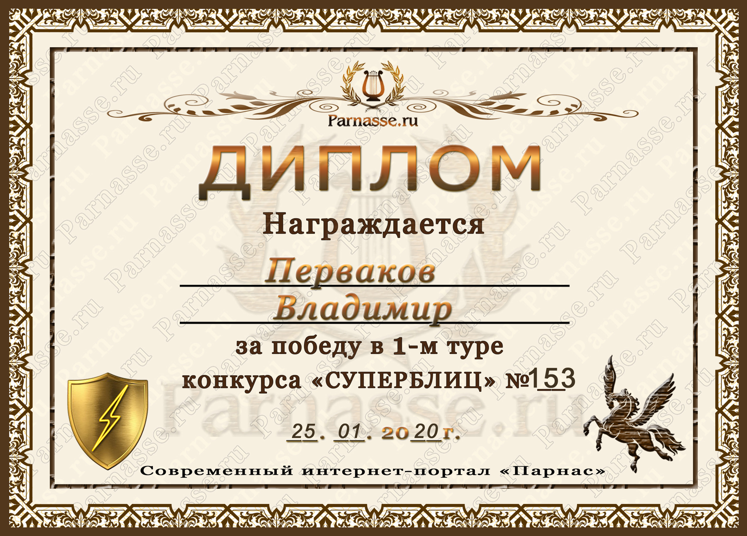 Диплом Победителя за 1 место в праздничном конкурсе "Поздравим Парнас с трёхлетием вместе!"
