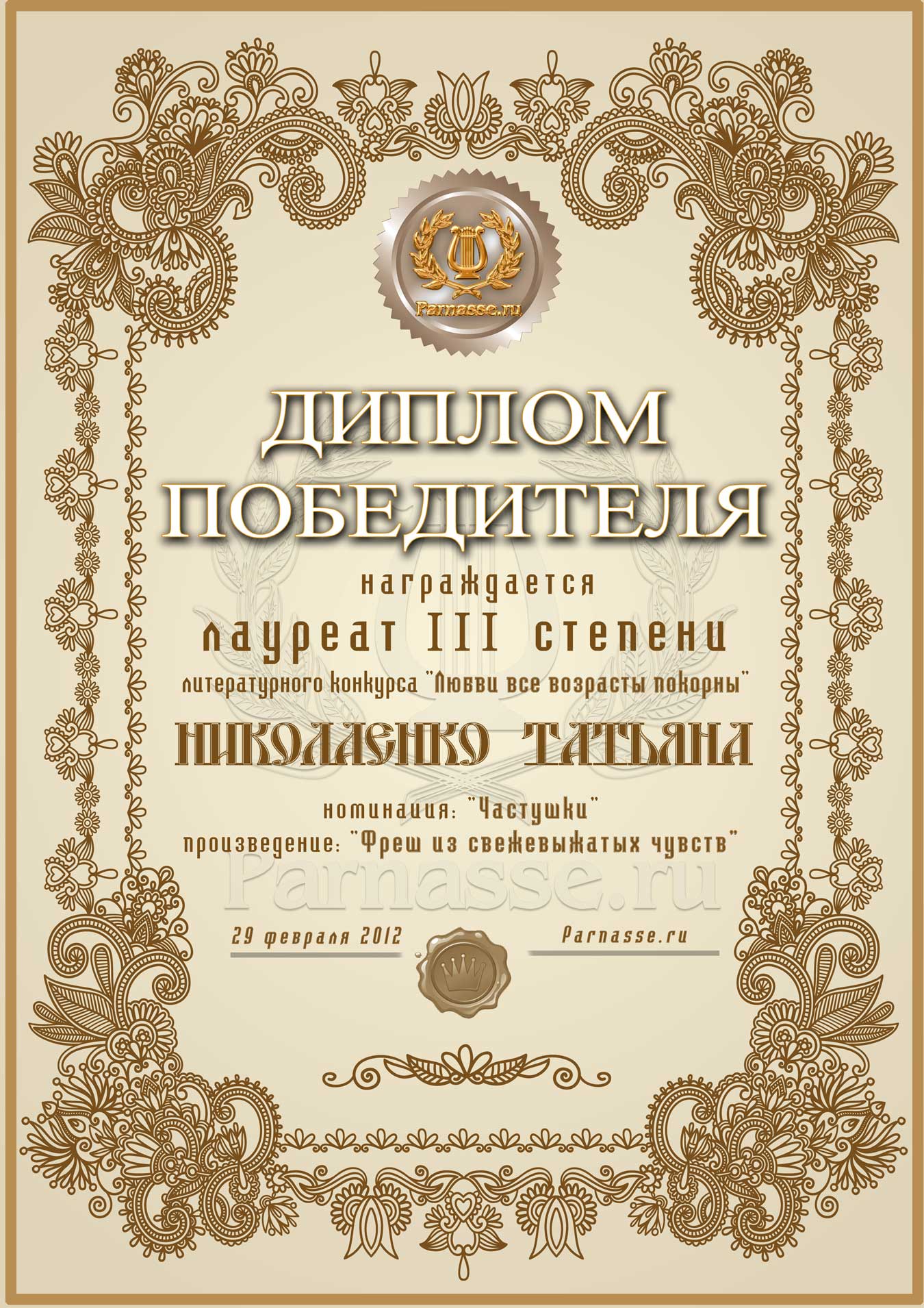 ![]() Лауреат III степени литературного конкурса «Любви все возрасты покорны»!