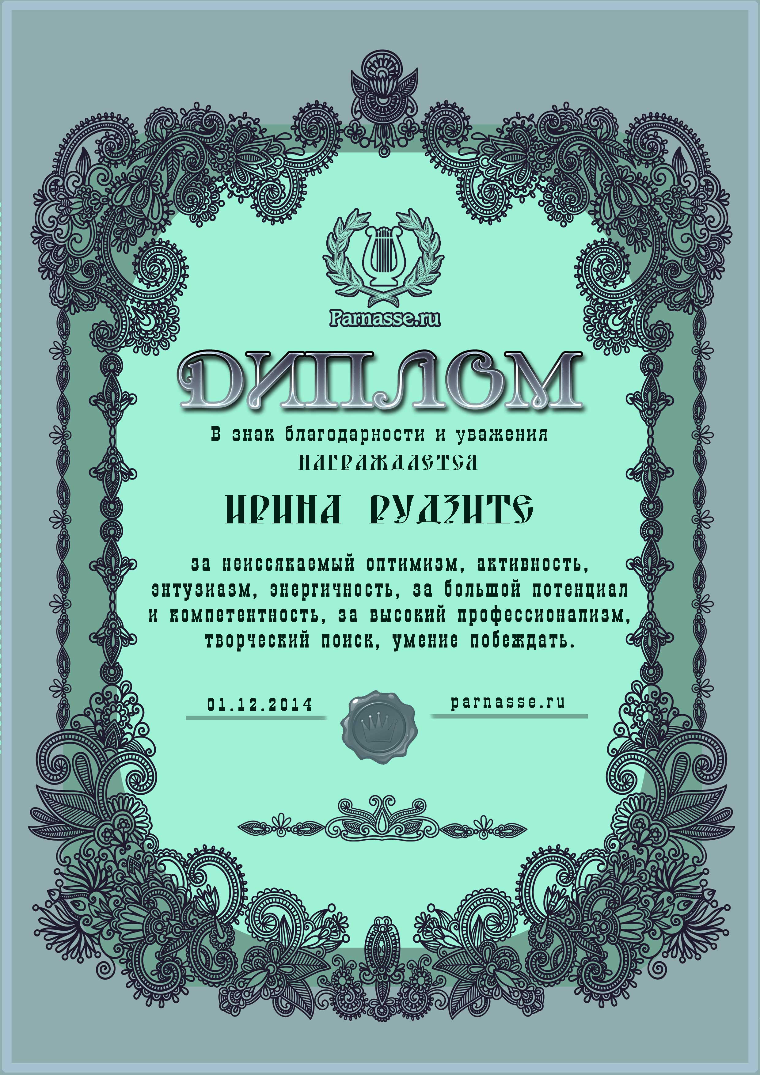 За неугасающую и неисчерпаемую творческую активность, постоянный контакт с Музой и признание сообществом "Парнасцев".От всей души желаем Вам, Ирина, здоровья, любви, успехов, благополучия, удачи и творческого вдохновения!