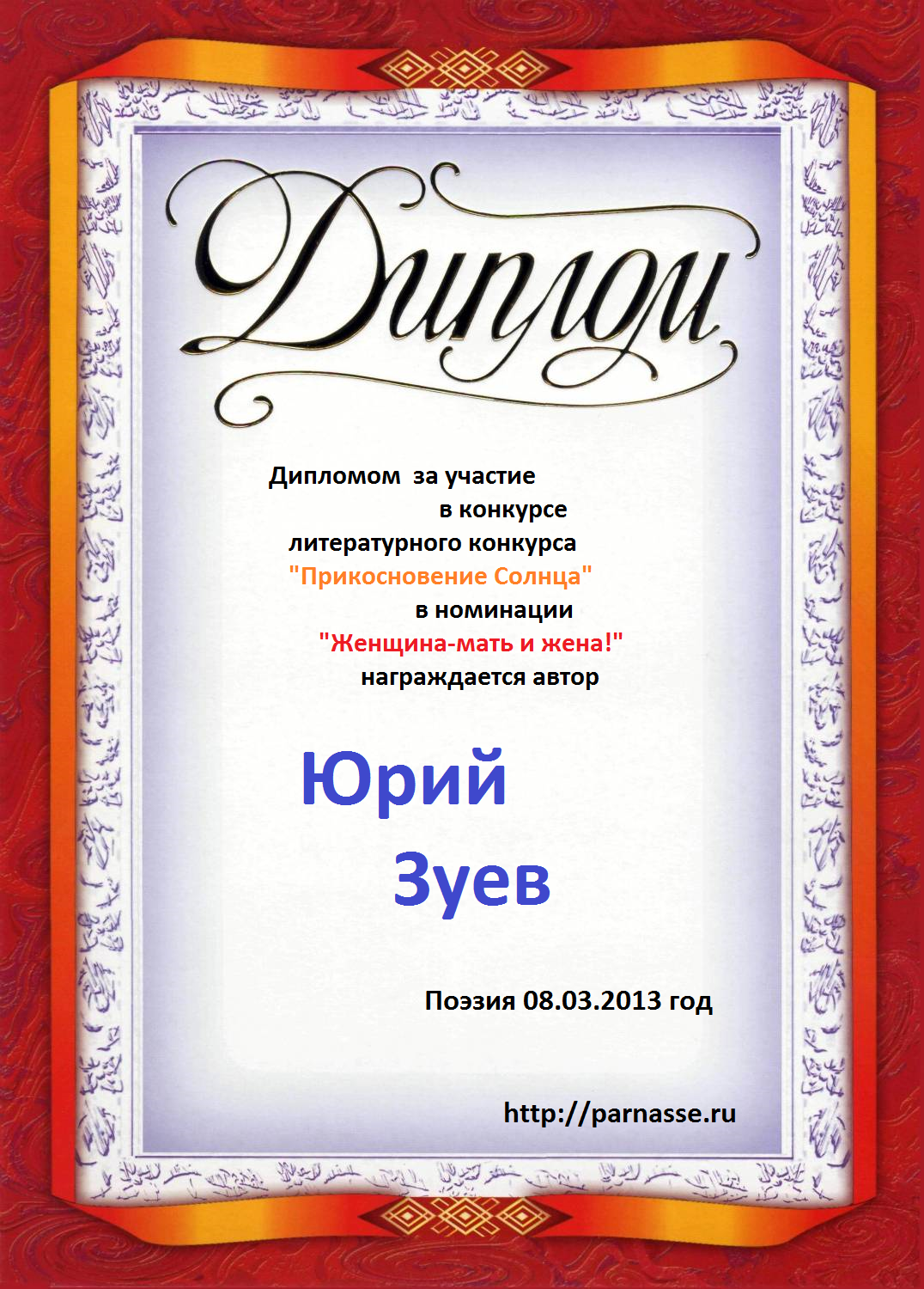 Диплом в конкурсе поэзии "Прикосновение Солнца"