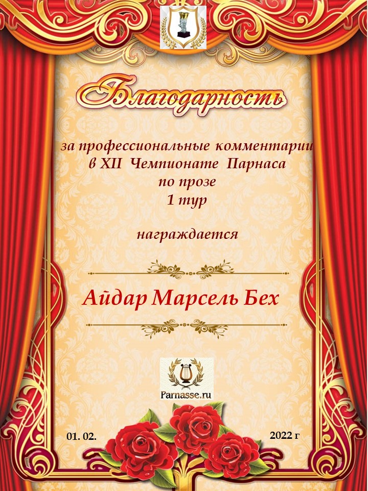 Большое спасибо за профессиональные и объективные комментарии в 1 туре X Чемпионата Парнаса по Прозе!