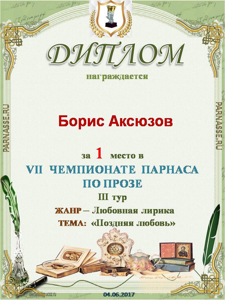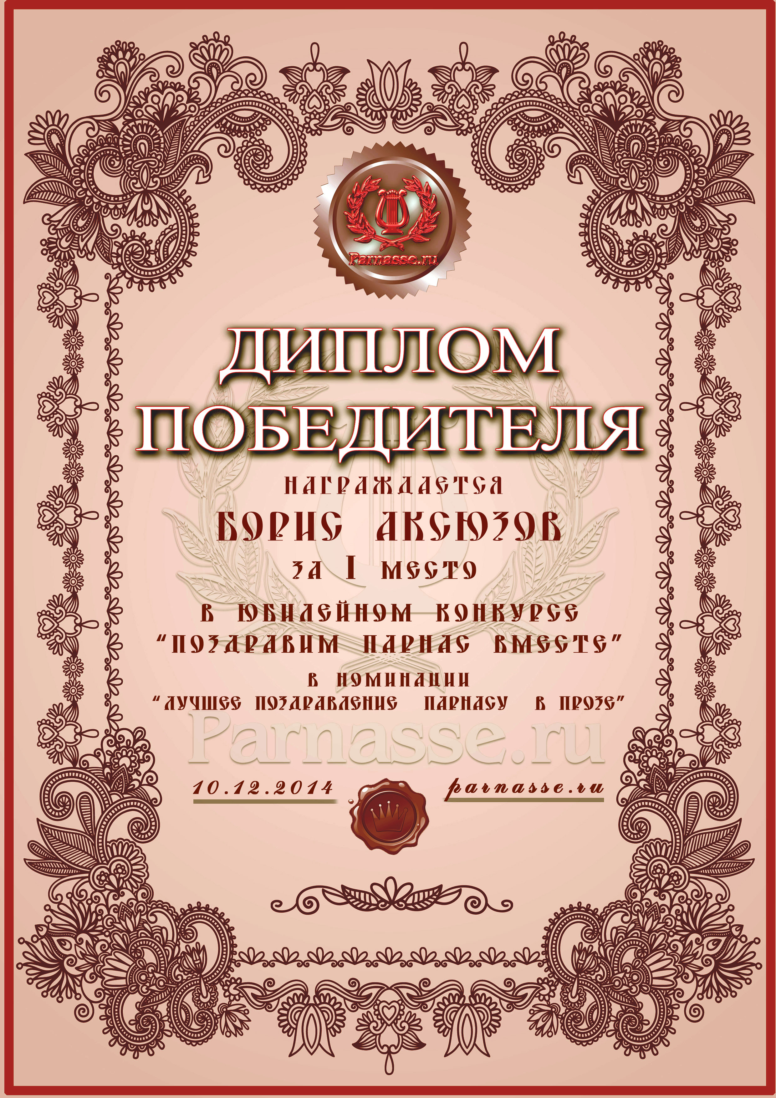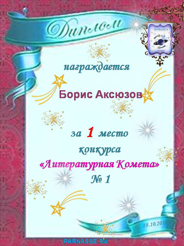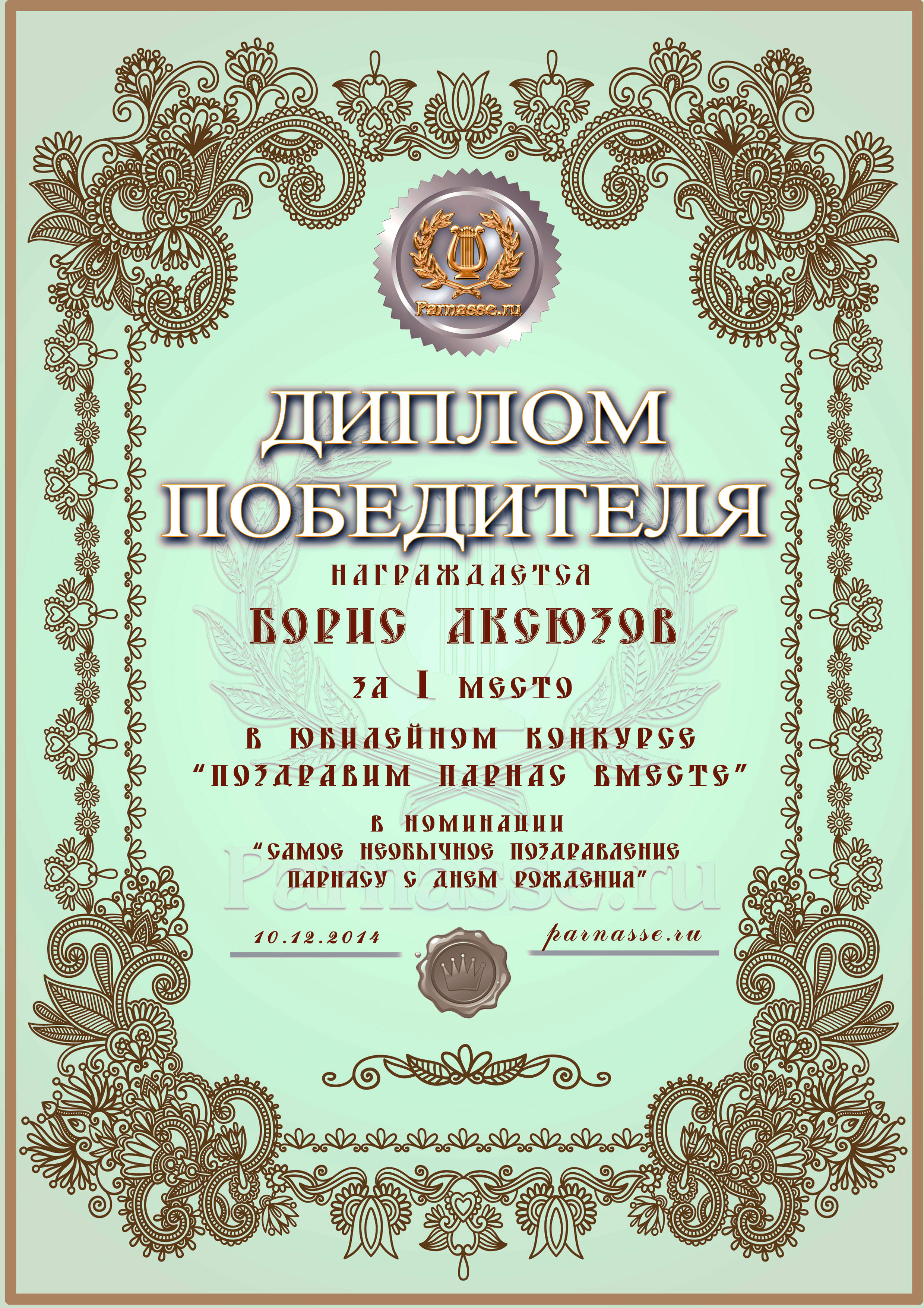 Диплом за 1 место в праздничном конкурсе "Поздравим Парнас с трёхлетием вместе!"