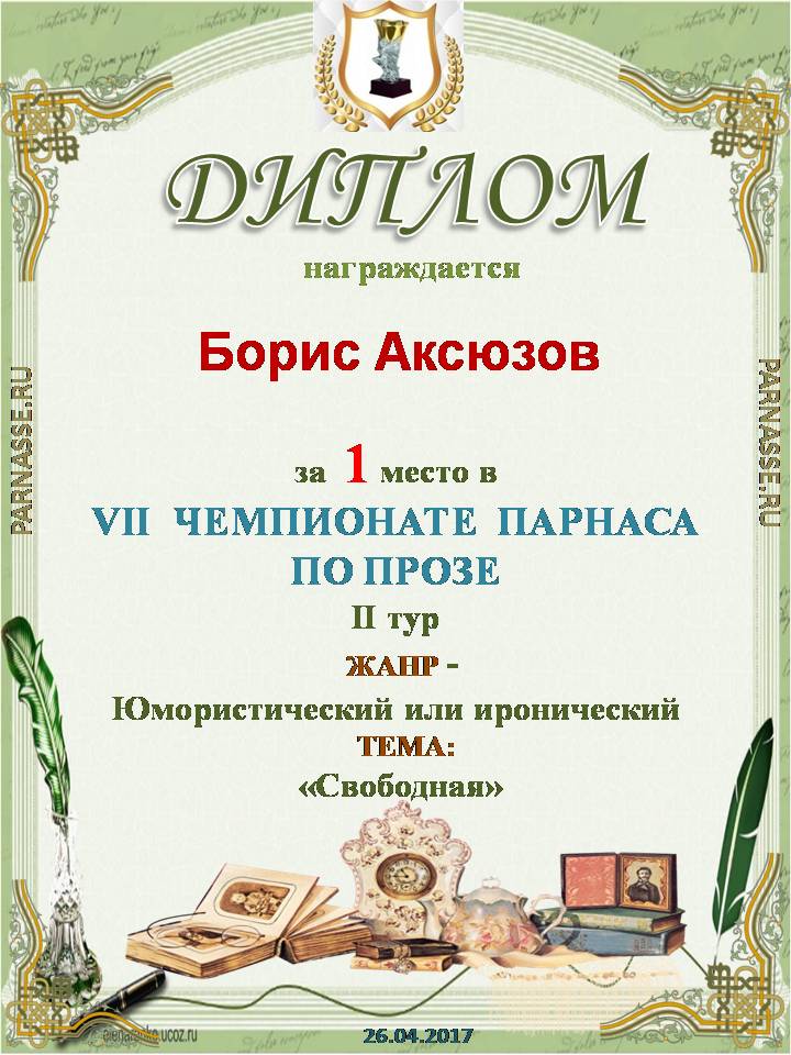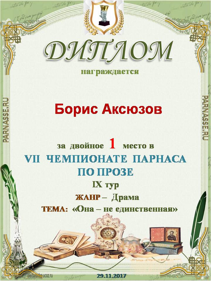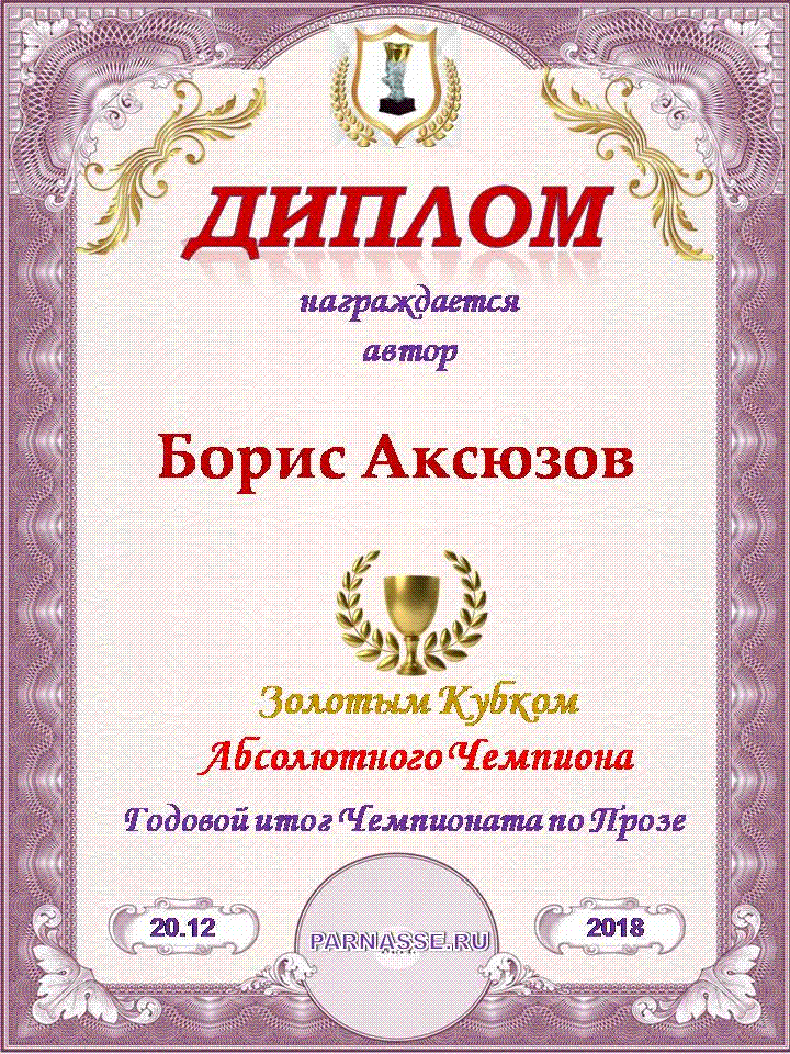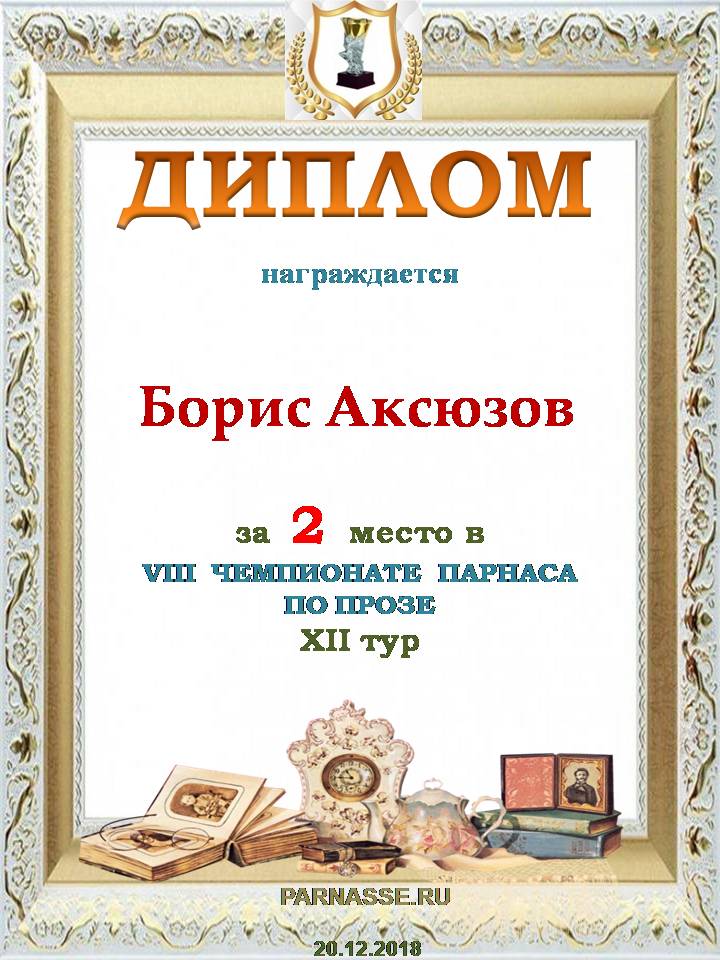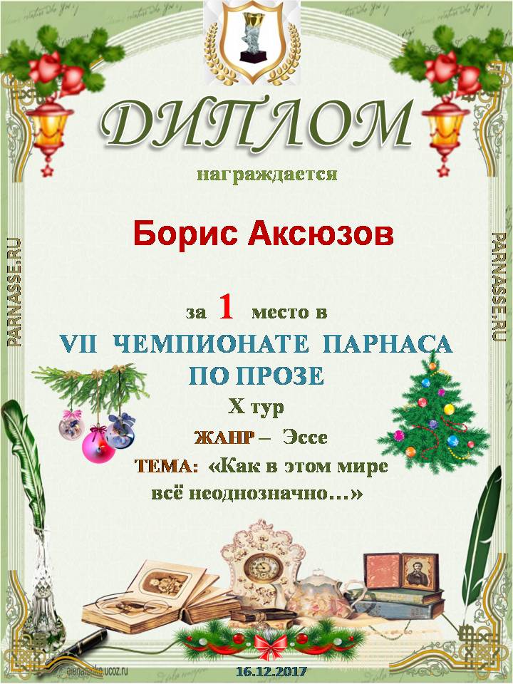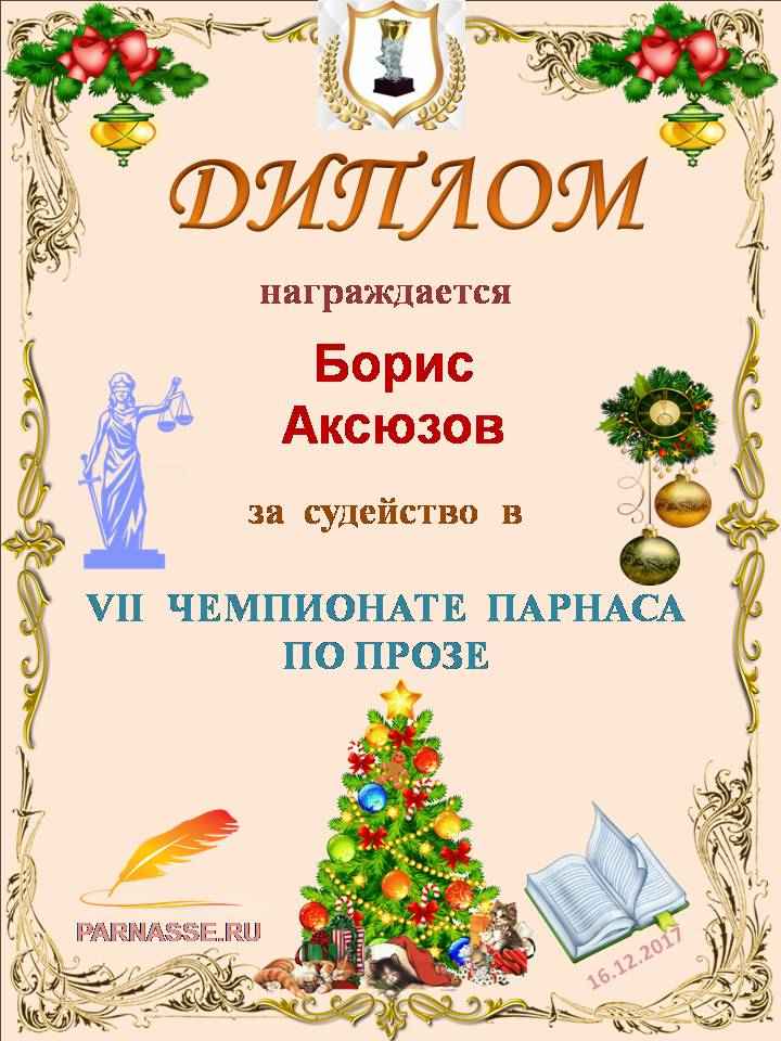 Борис! Поздравляем Вас со вторым местом в Шестом Чемпионате Парнаса по Прозе! Желаем Вам в наступающем году новых творческих находок! Благополучия Вам, счастья, здоровья и всех других благ!