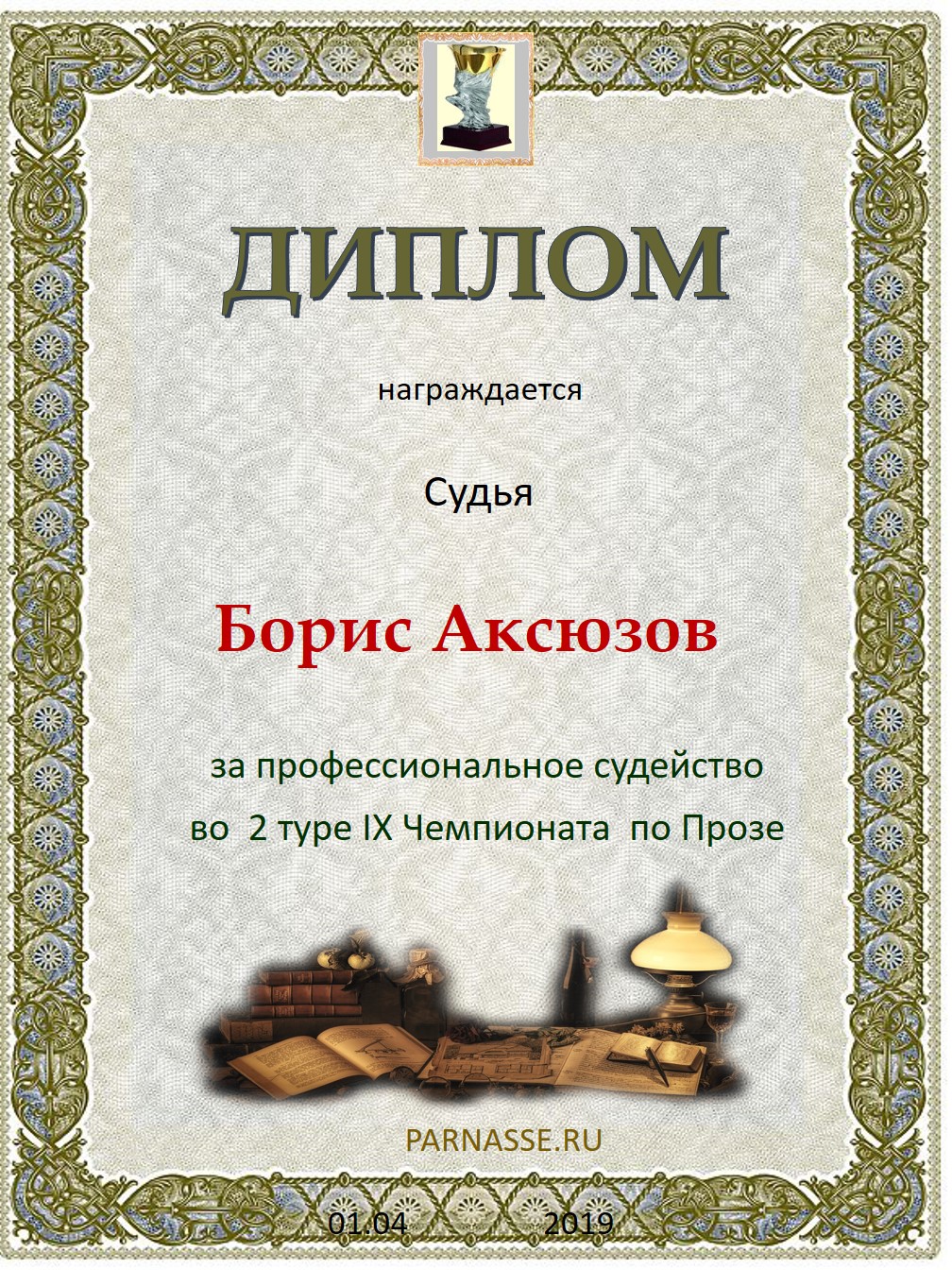 За высокопрофессиональное судейство в 4 туре IX Чемпионата Парнаса по Прозе