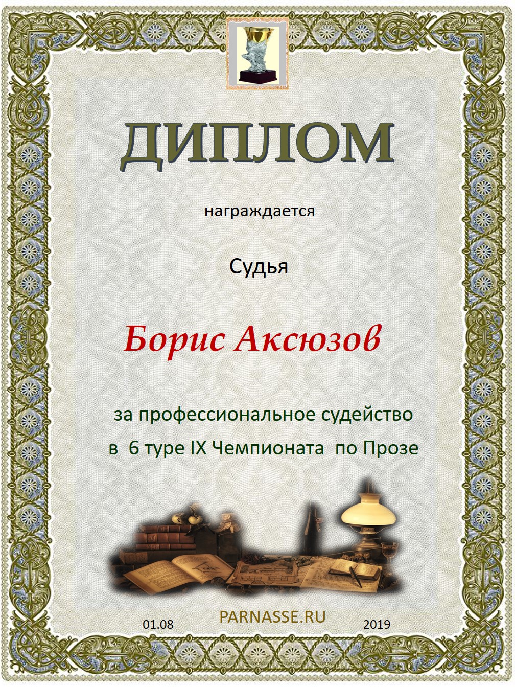 За высокопрофессиональное судейство в 6 туре IX Чемпионата Парнаса по Прозе