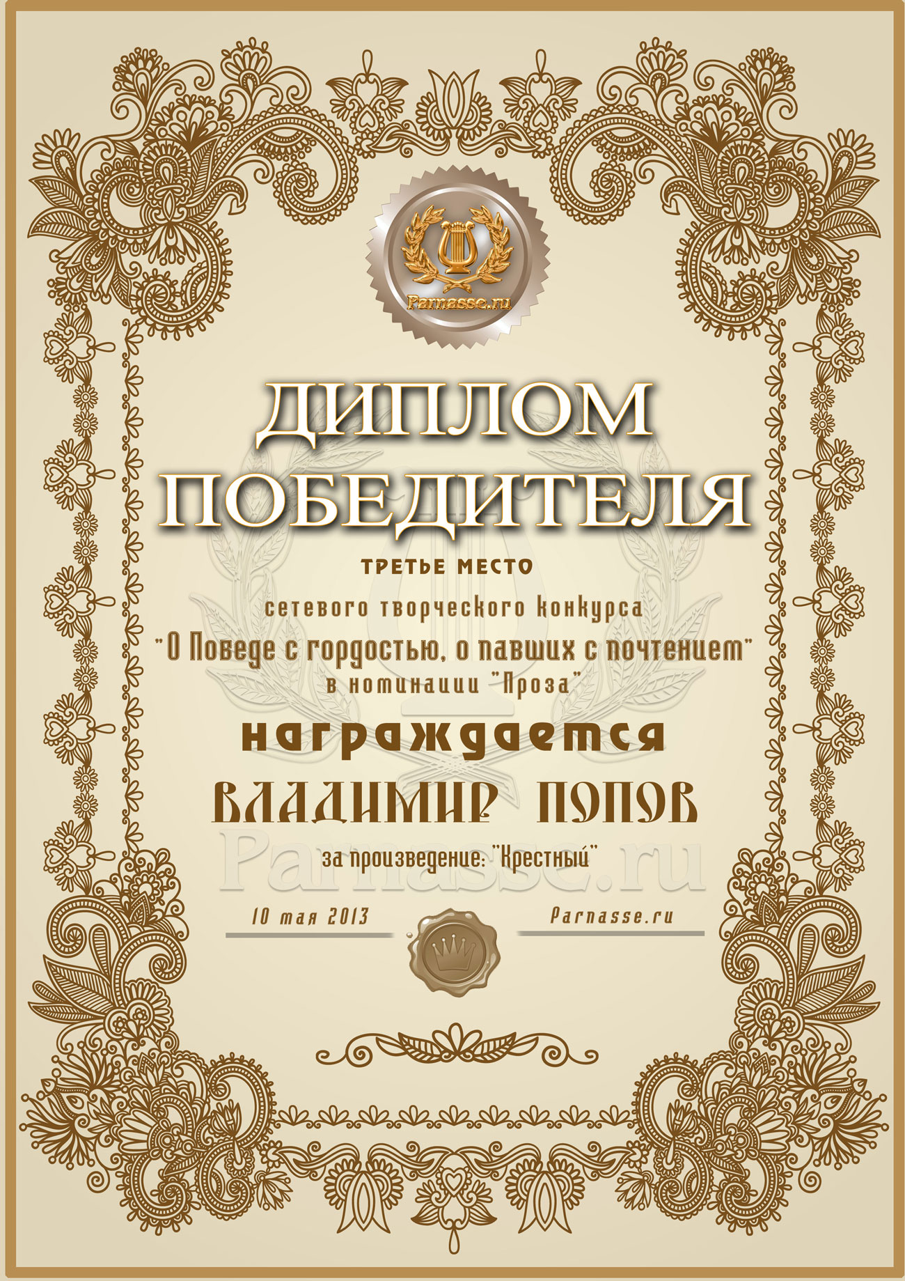 Третье место в музыкально-литературном конкурсе «О Победе с гордостью, о павших – с почтением!» Судейское голосование. Номинация в прозе «Солдаты Великой Победы»! Произведение "КРЕСТНЫЙ"! Поздравляем с блестящей победой!