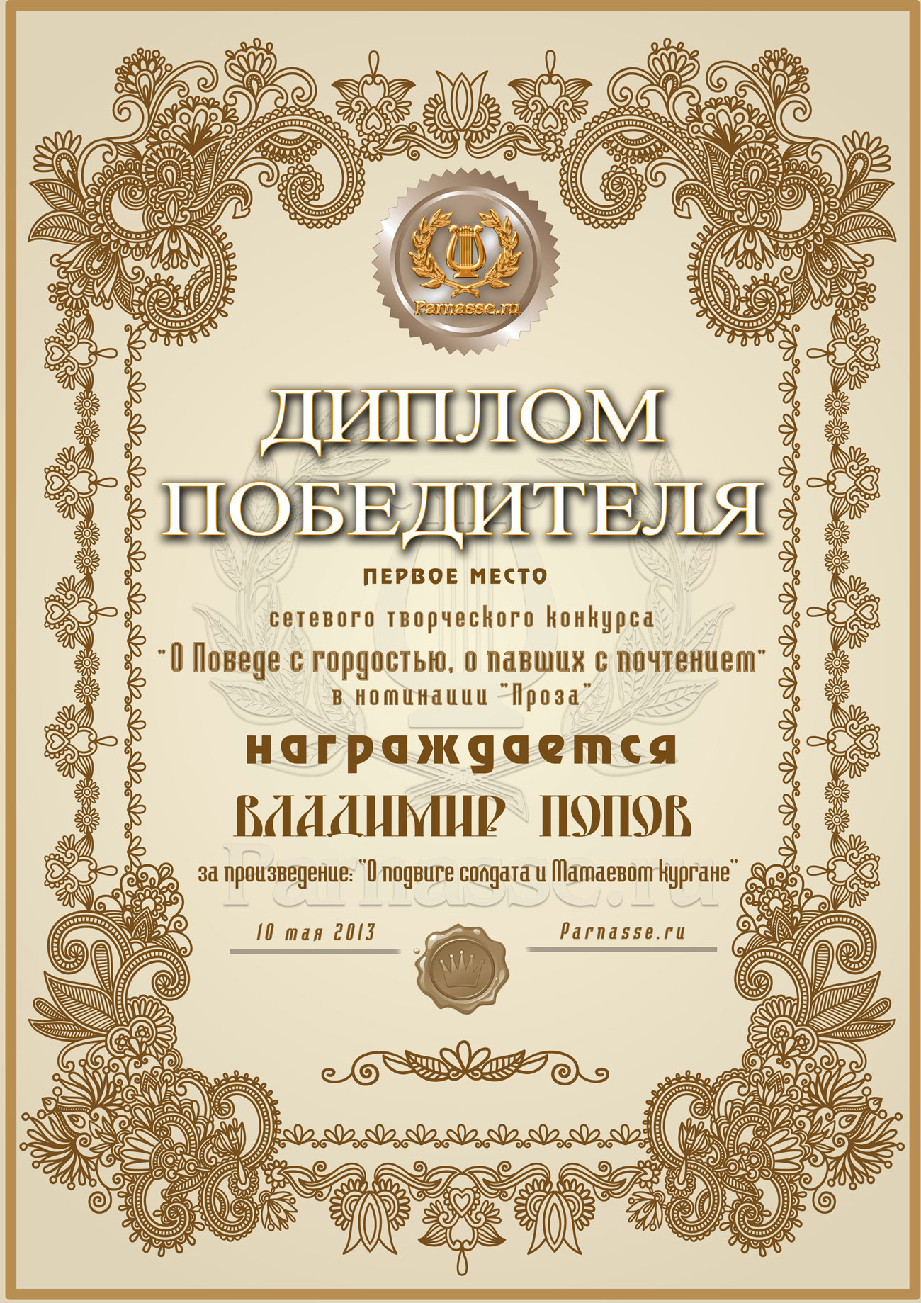 Первое место в конкурсе "О Победе с гордостью, о павших с почтением" (За произведение "О подвиге солдата и Мамаевом кургане")