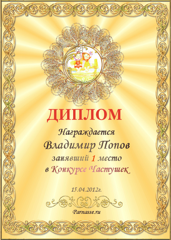 Победителю музыкально-литературного конкурса "Ах, Мама, Мамочка, родная!" Номинация "Рассказы-сказки о Мамочке". Поздравляем! Счастья Вам и всего замечательного. Желаем хорошего настроения, вдохновения и удачи во всем. Спасибо за участие в конкурсе. С Уважением, Администрация.