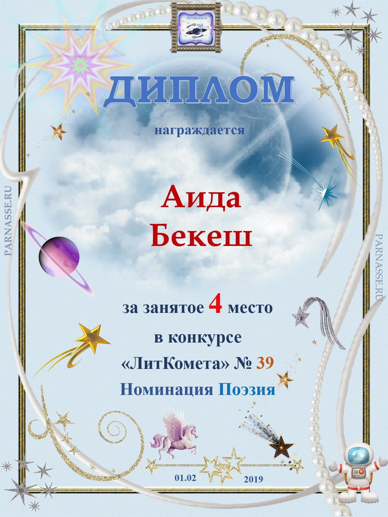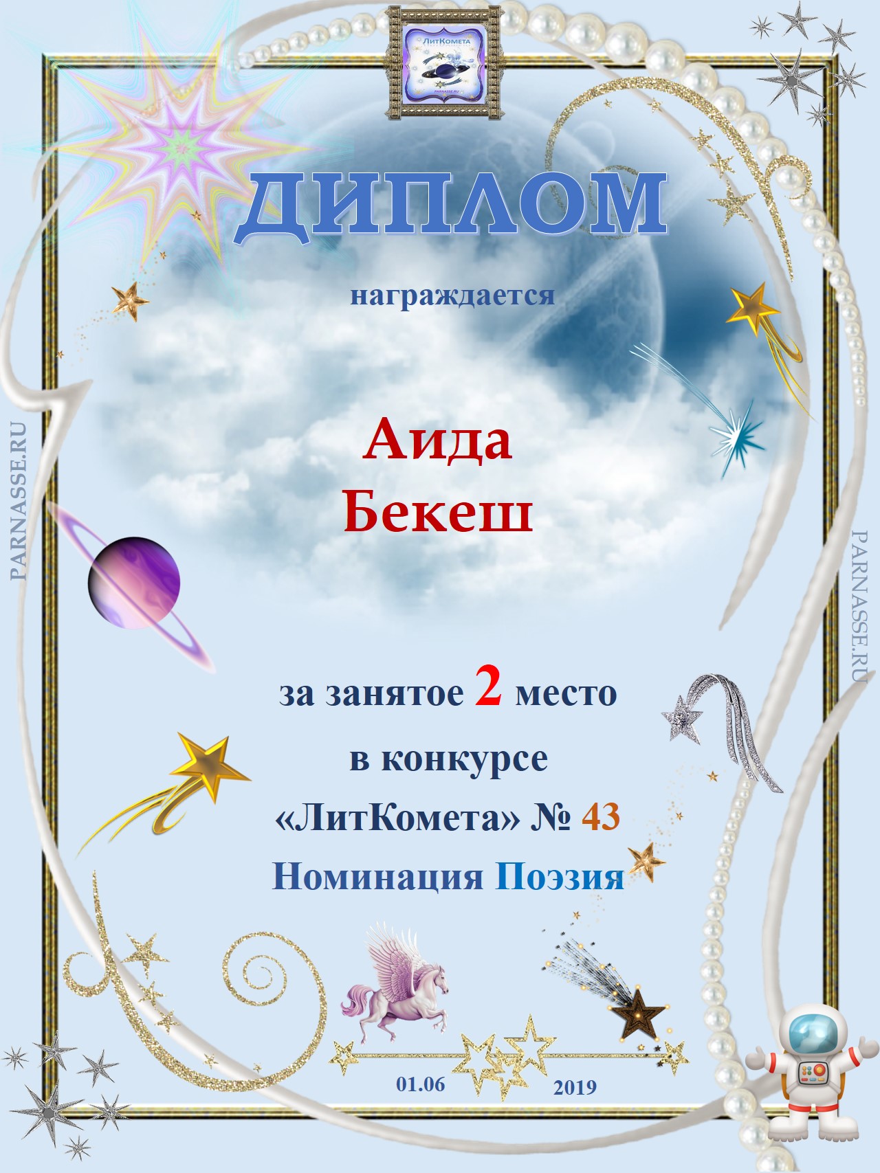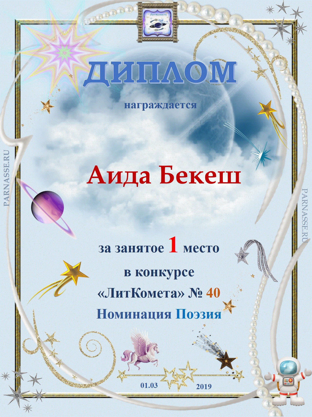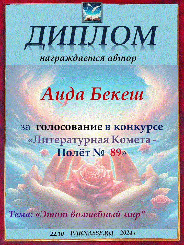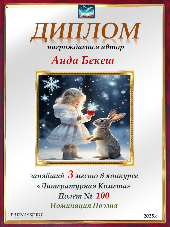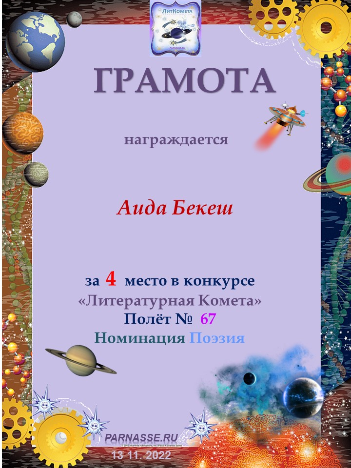 Поздравляю с занятым 1 местом в конкурсе “Литературная Комета – Полёт № 45» - Номинация Поэзия