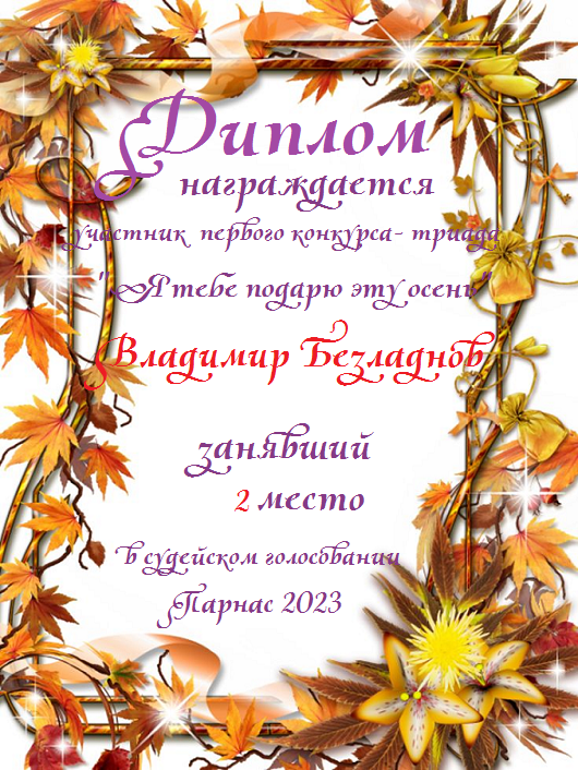 Второе место в судейском голосовании по итогам конкурса - триада «Листопад с дождём в обнимку кружит»