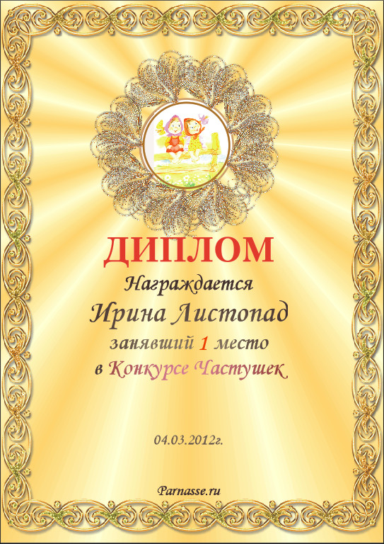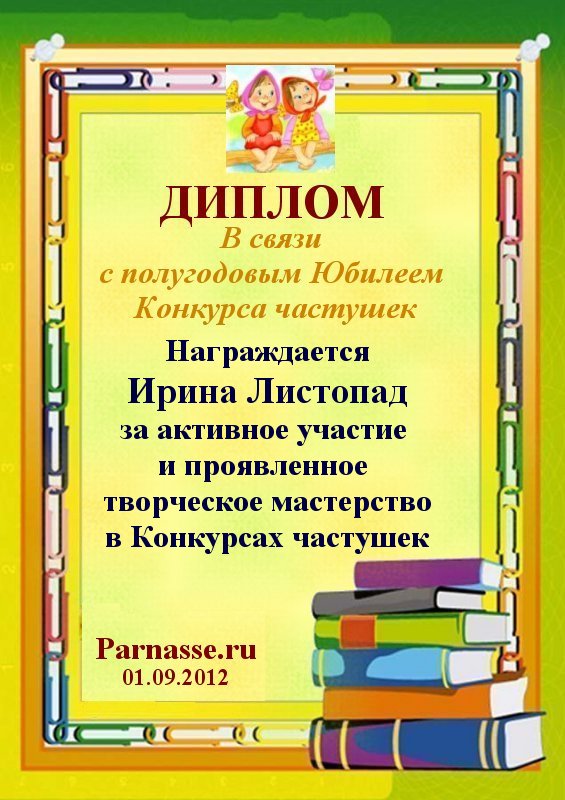 Диплом в 1 годовом итоговом конкурсе АКРОСТИХА в номинации "Лучший друг конкурса" (за неоценимую помощь в оформлении дипломов и грамот!ПОЗДРАВЛЯЮ!