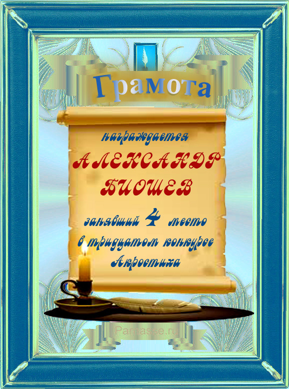 За неугасающую и неисчерпаемую творческую активность, постоянный контакт с Музой и признание сообществом "Парнасцев".От всей души желаем Вам, Александр, здоровья, любви, успехов, благополучия, удачи и творческого вдохновения!