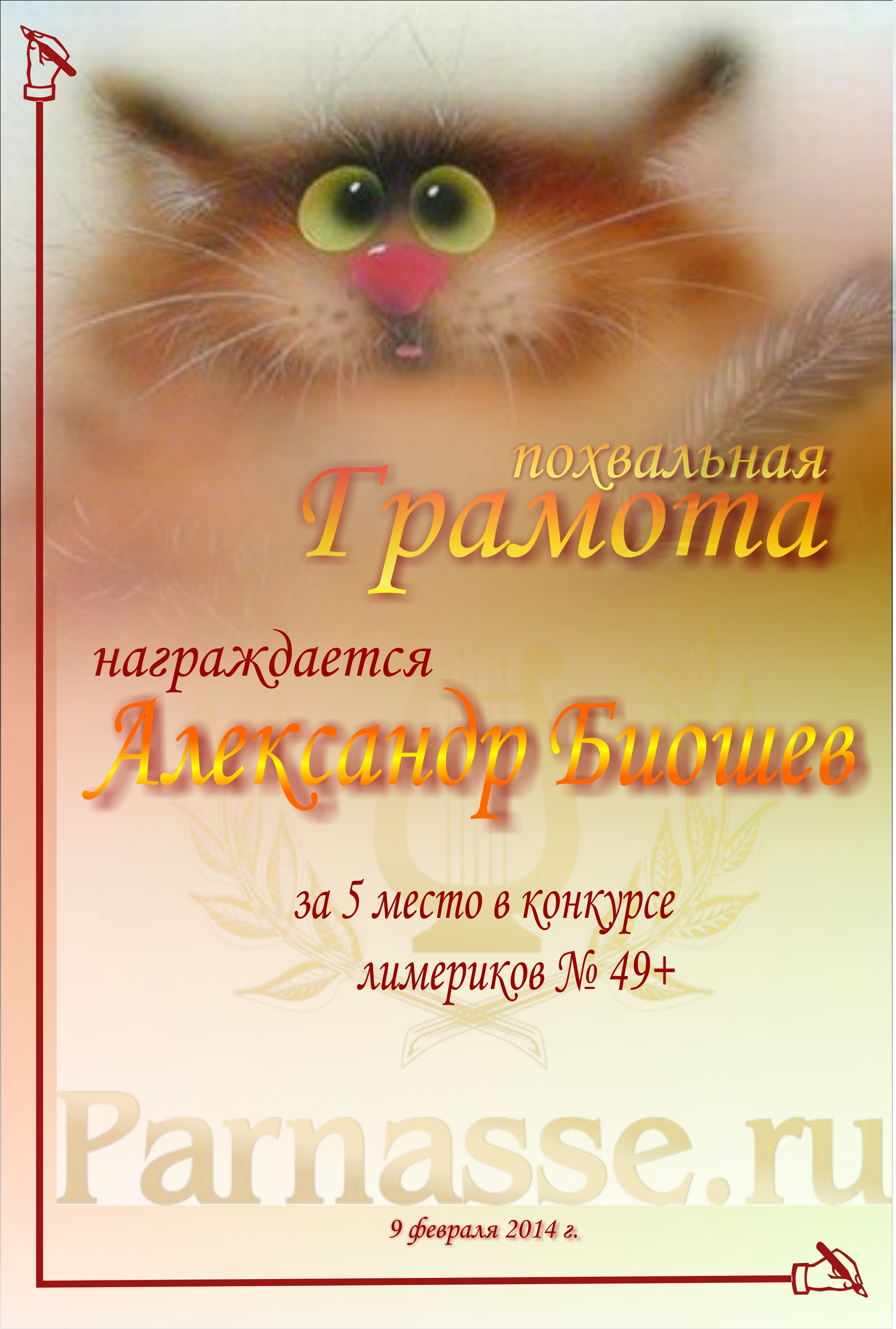 Похвальная грамота за активное участие в конкурсе лимериков № 49+ (9.02.2014 г.)