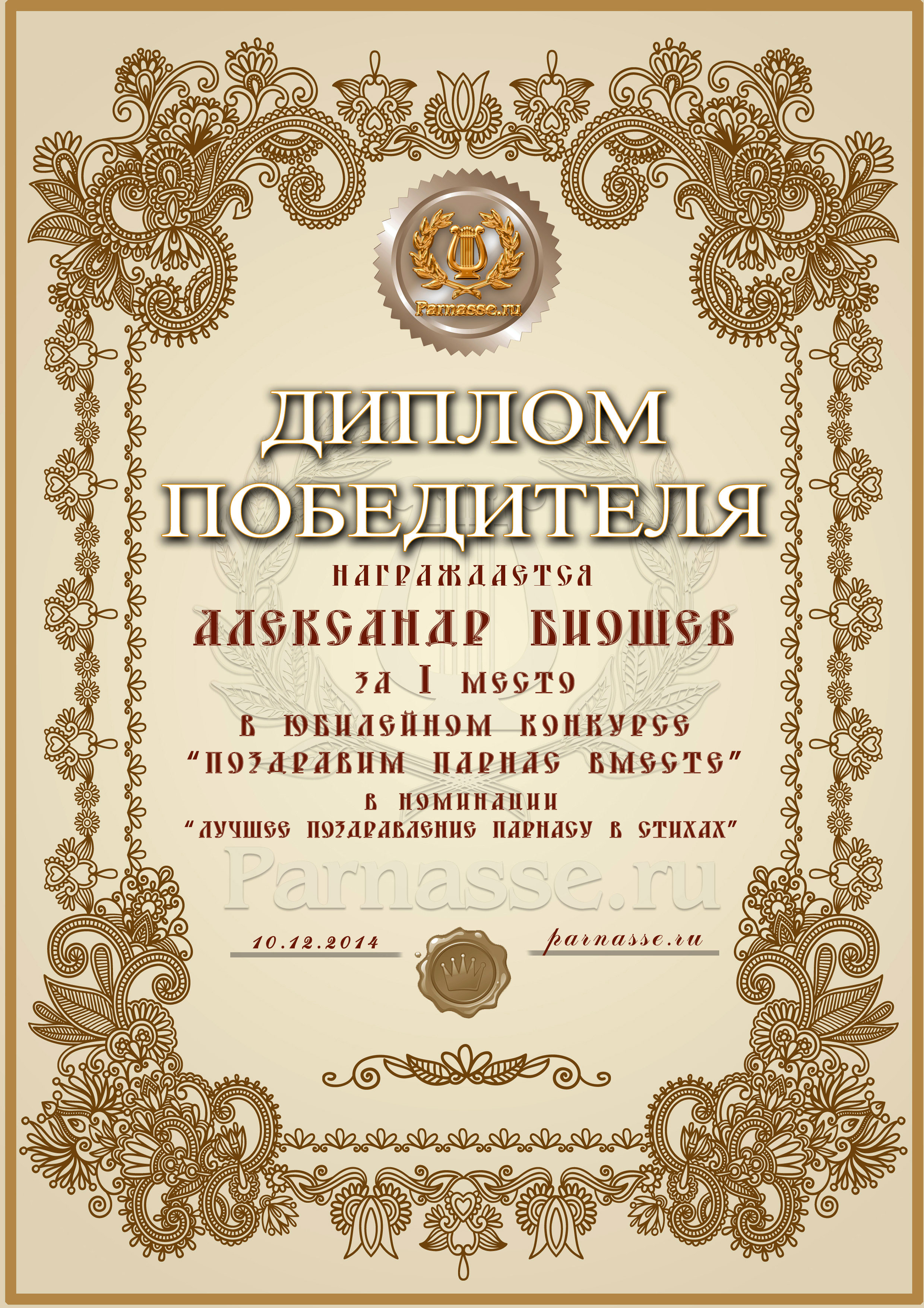Первое место в праздничном конкурсе "ПОЗДРАВИМ ПАРНАС ВМЕСТЕ!", в номинации "Лучшее стихотворное поздравление Парнасу". Позвольте от всей души выразить Вам благодарность за прекрасные поэтические слова поддержки, самые тёплые пожелания нашему Парнасу и пожелать Вам новых побед на литературном поприще, успехов в жизни и всех Ваших начинаниях! Будьте счастливы, здоровы, пусть удача не покидает Вас ни на минуту и от всей души СПАСИБО! Оставайтесь с нами и мы будем вновь и вновь встречать Дни рождения "Парнаса" в одной дружной, душевной компании! Произведение "Парнас, с трёхлетием тебя"