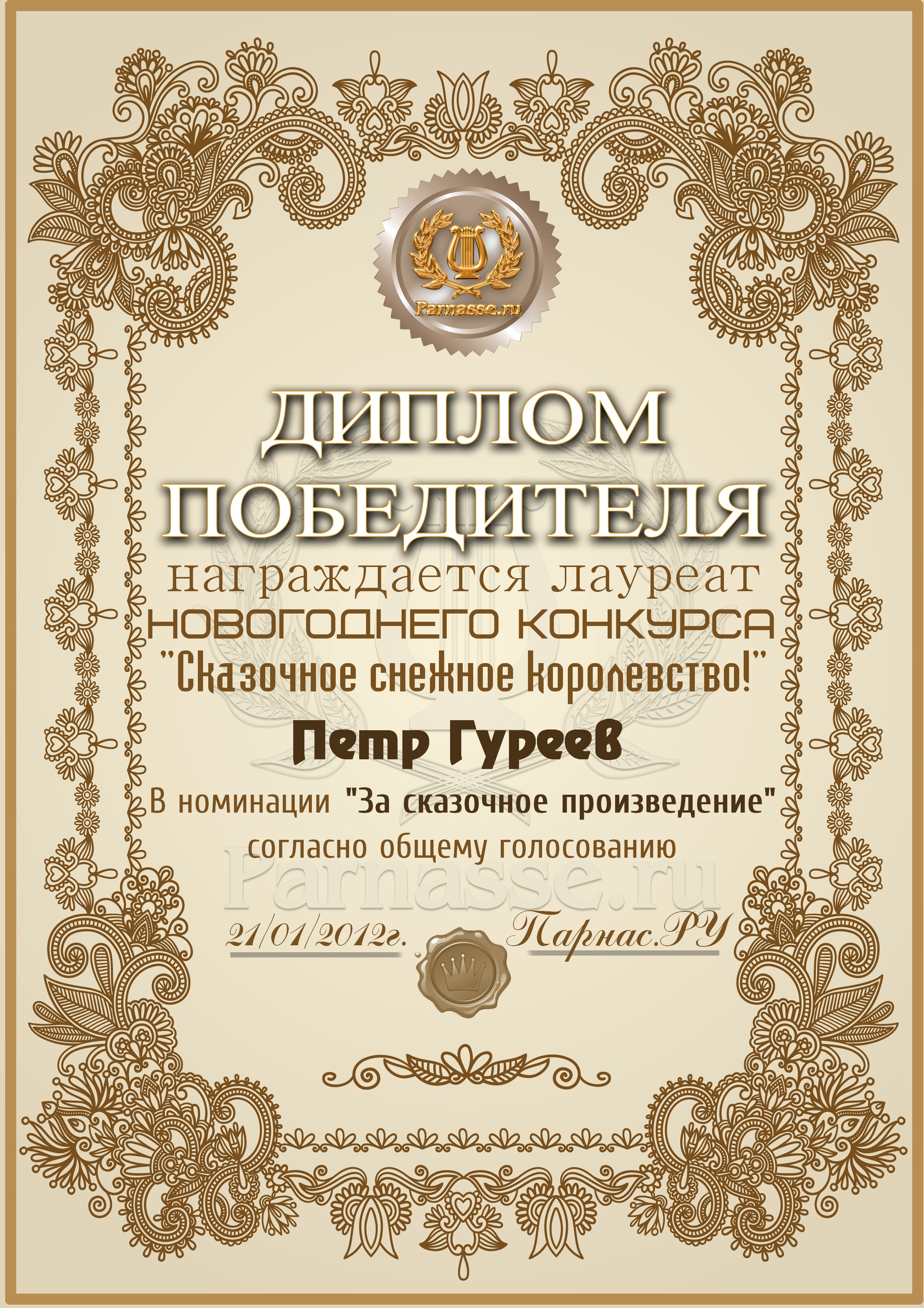 Лауреату новогоднего конкурса "Сказочное снежное королевство!" за победу в номинации "За самое сказочное произведение" согласно общему голосованию.