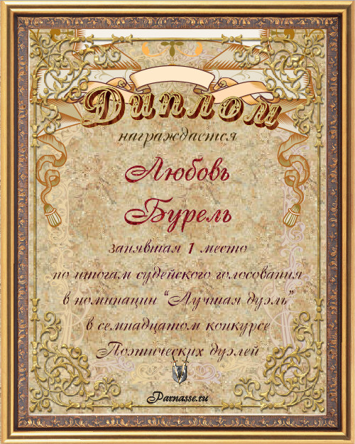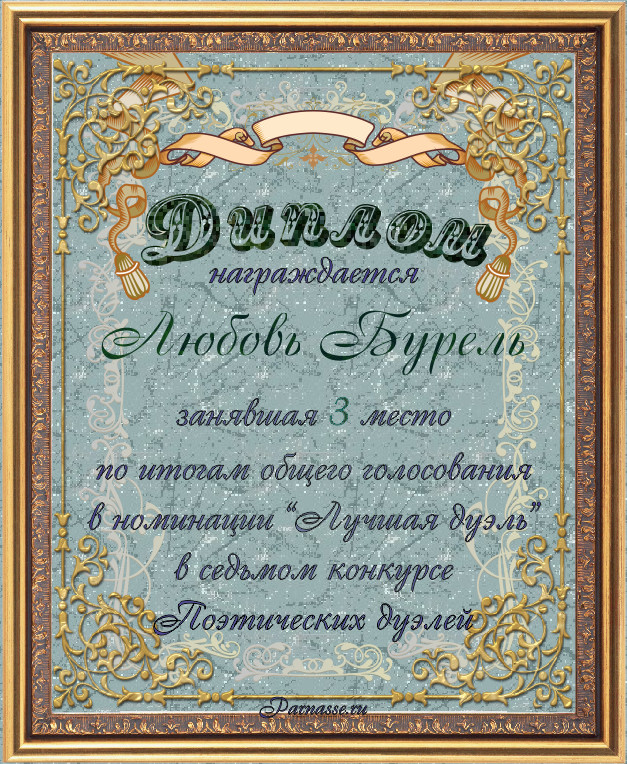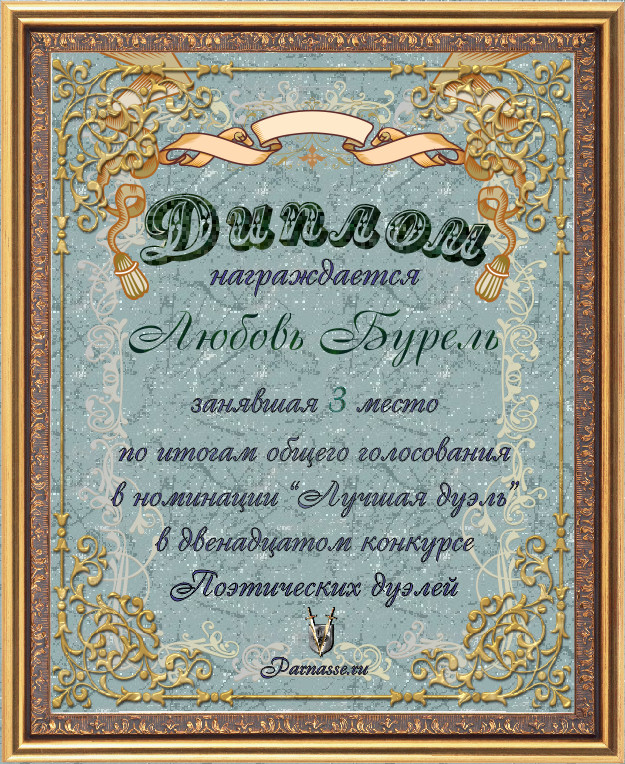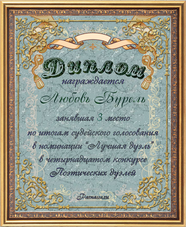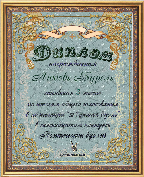 Диплом за 3-е место в номинации "ЛУЧШАЯ ДУЭЛЬ" по итогам общего голосования в 15ом конкурсе поэтических дуэлей (№ 5.2)