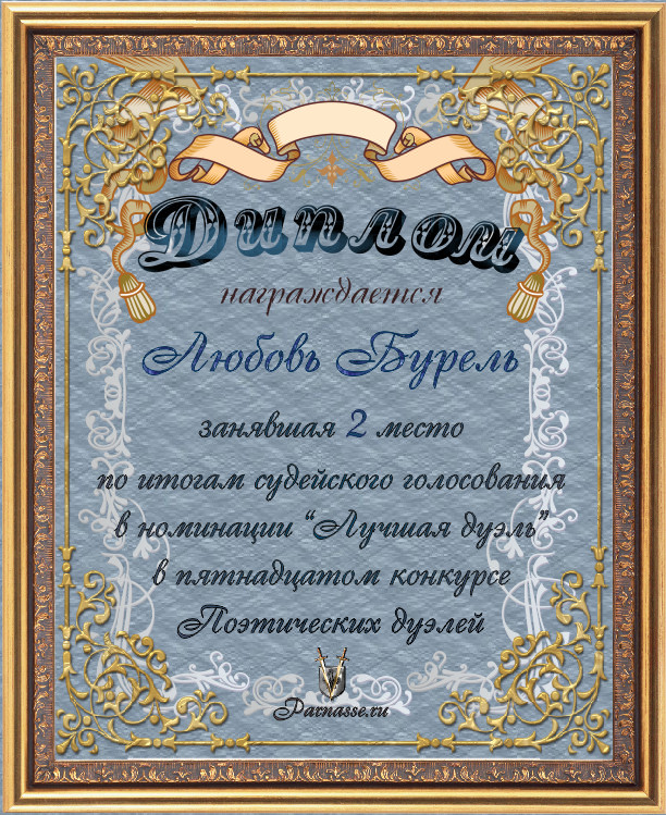 Диплом за 2-е место в номинации "ЛУЧШАЯ ДУЭЛЬ" по итогам судейского голосования в 15ом конкурсе поэтических дуэлей (№ 8.1)