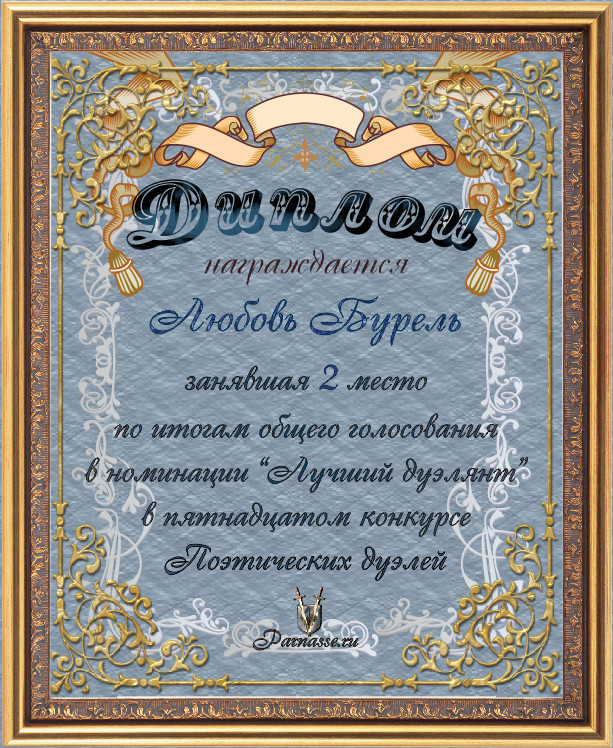 Диплом за 2-е место в номинации "ЛУЧШИЙ ДУЭЛЯНТ" по итогам общего голосования в 15ом конкурсе поэтических дуэлей