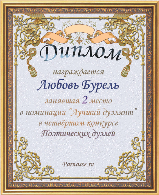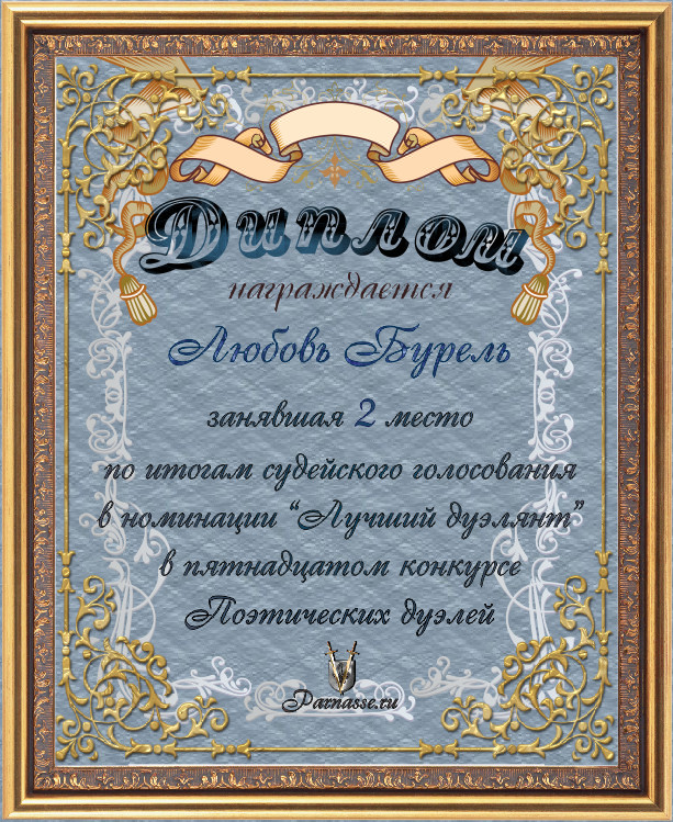 Диплом за 2-е место в номинации "ЛУЧШИЙ ДУЭЛЯНТ" по итогам судейского голосования в 15ом конкурсе поэтических дуэлей