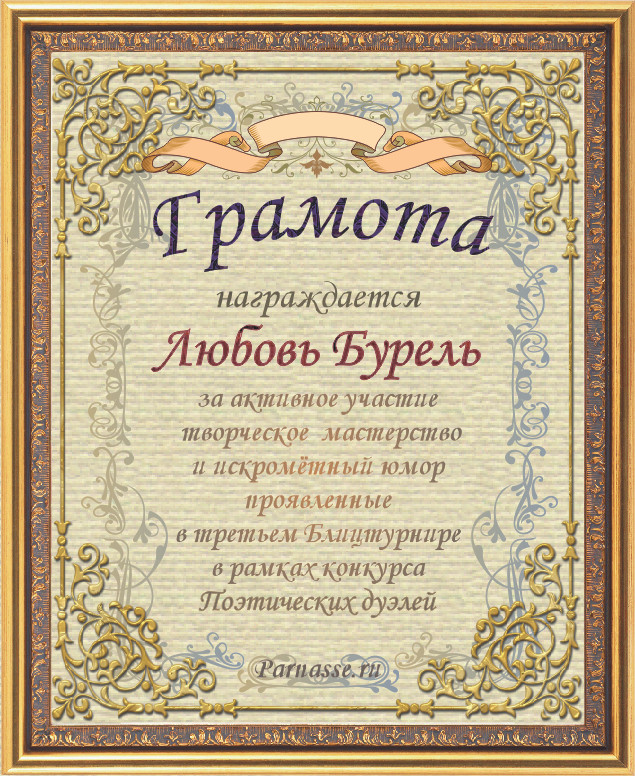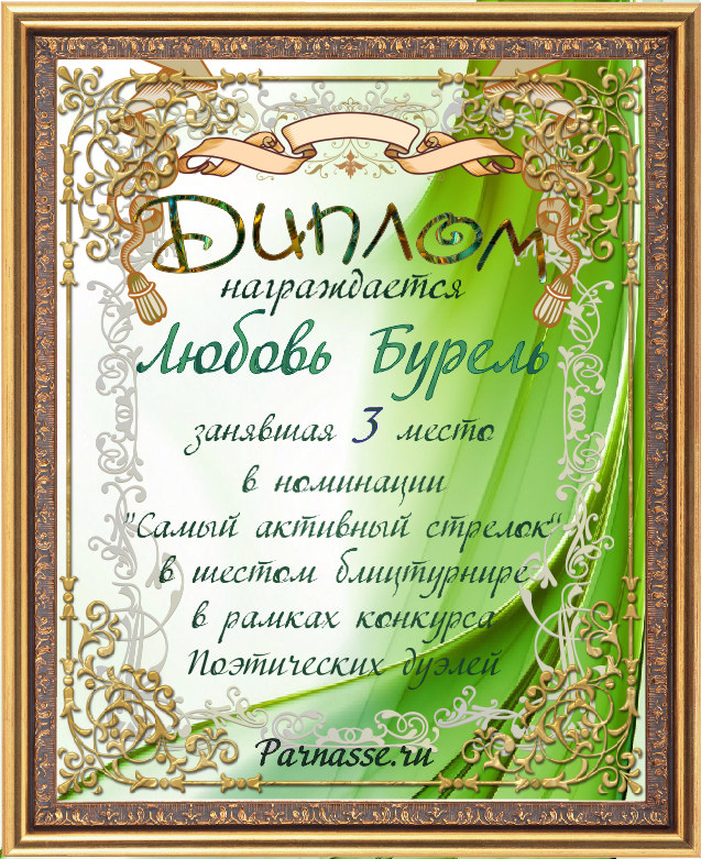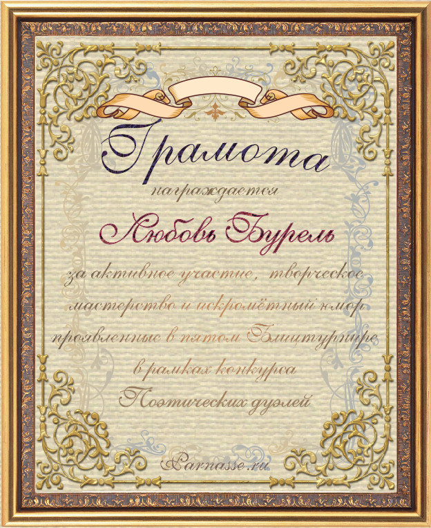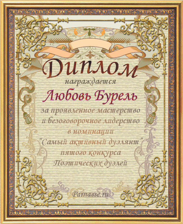 Диплом присуждён в номинации "самый активный дуэлянт" пятого конкурса поэтических дуэлей
