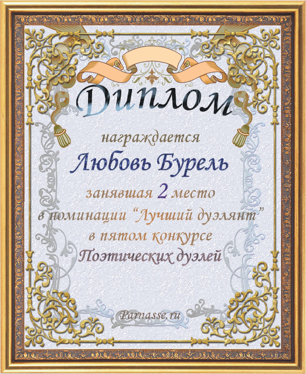 Диплом за второе место в номинации "Лучший дуэлянт" в пятом конкурсе Поэтических дуэлей