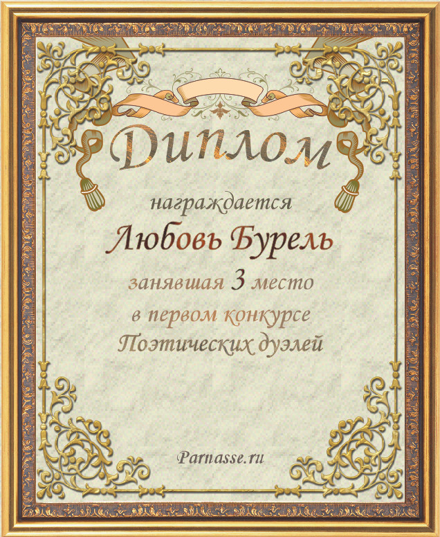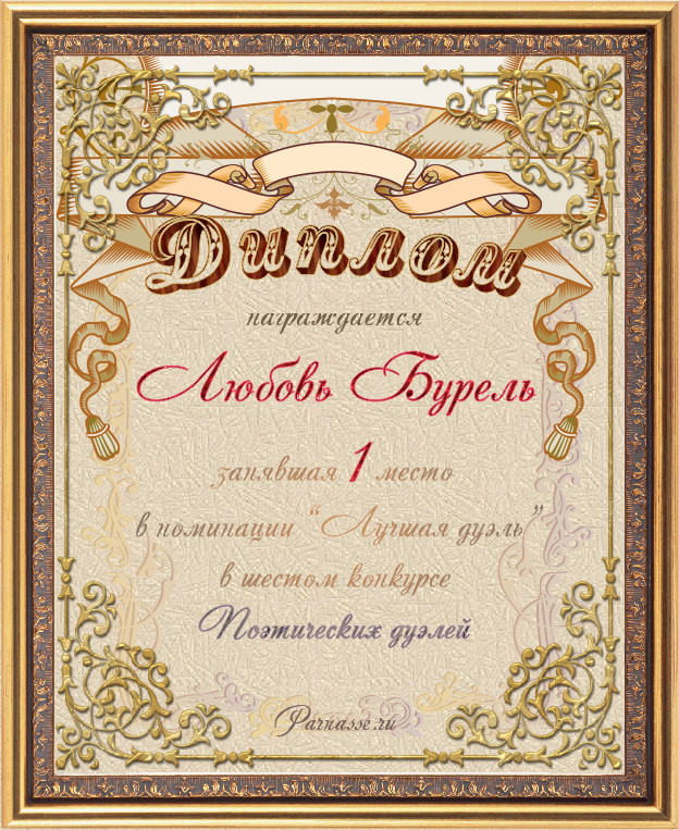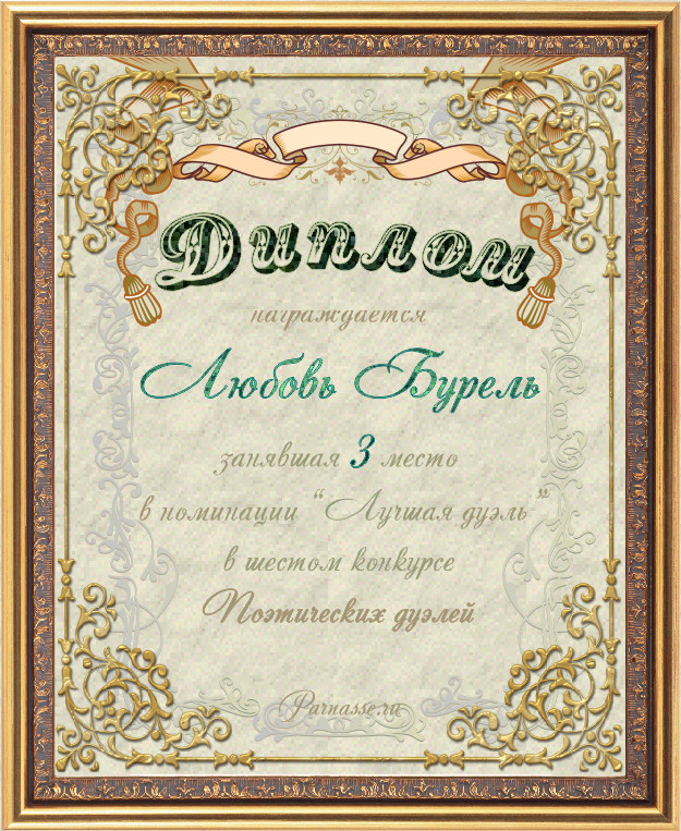 Диплом за 3-е место в номинации "Лучшая дуэль" в шестом конкурсе поэтических дуэлей (дуэль 19.1)