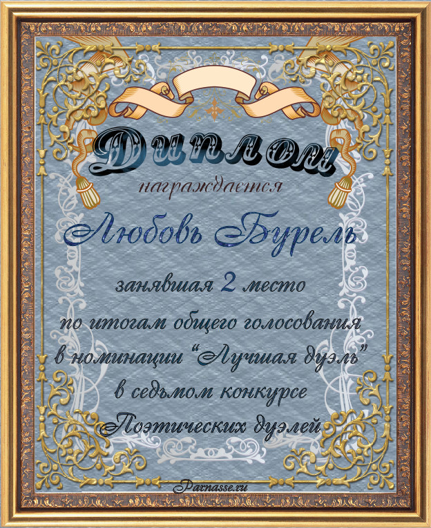 Диплом за 2-е место в номинации "Лучшая дуэль" по итогам общего голосования в седьмом конкурсе поэтических дуэлей