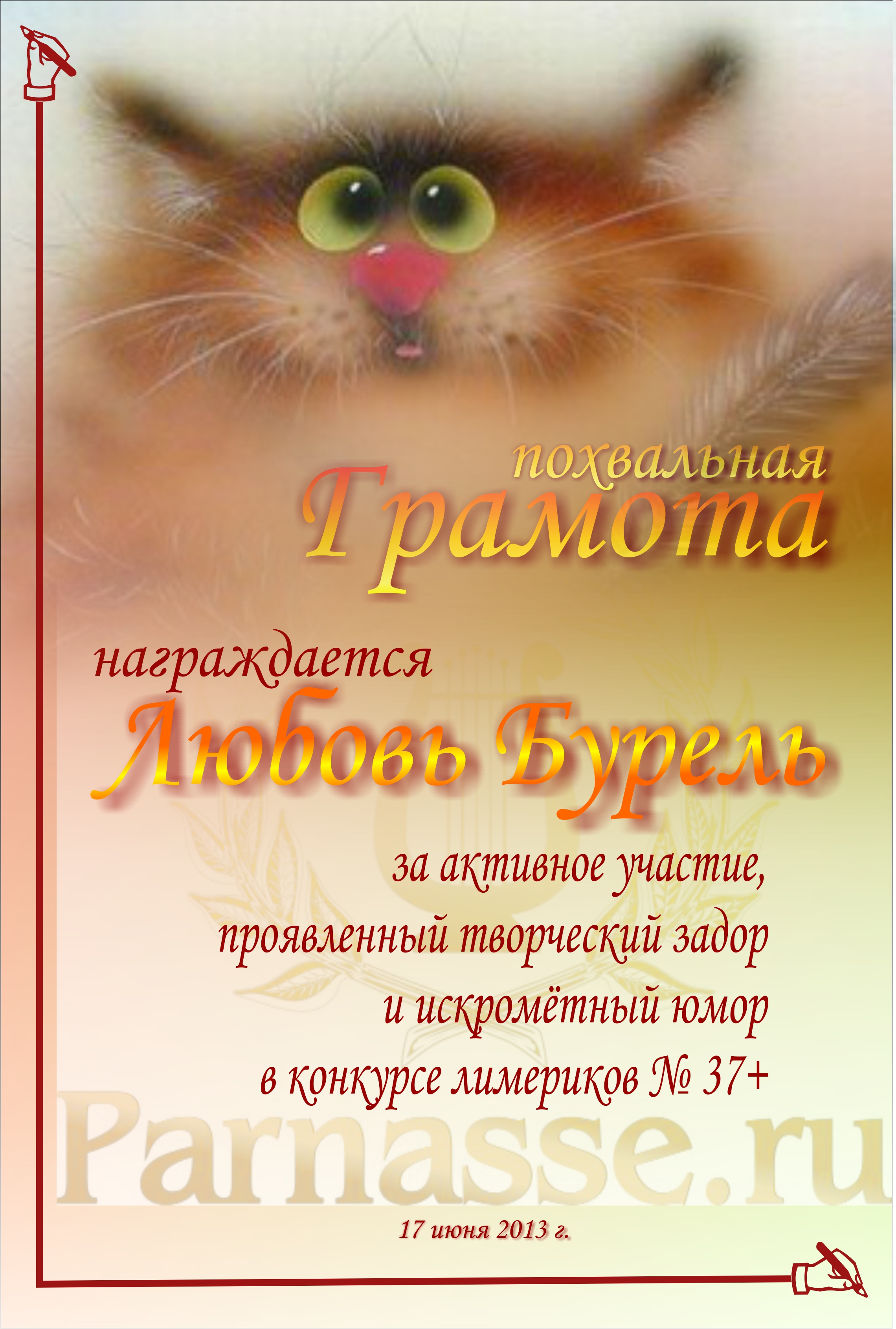 Похвальная грамота за 4 место в конкурсе лимериков № 37+ (17.06.2013 г.)