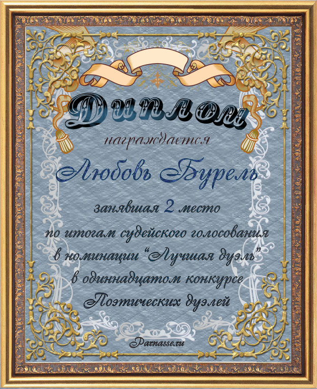Диплом за 2-е место в номинации "Лучшая дуэль" по итогам судейского голосования в одиннадцатом конкурсе поэтических дуэлей (№ 7.3)