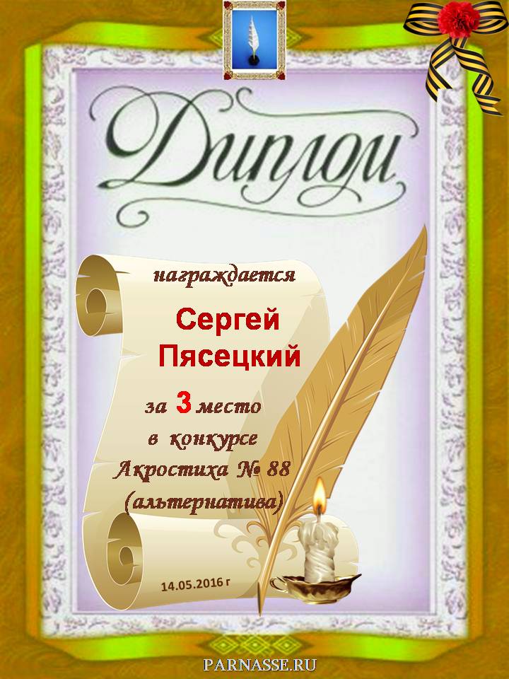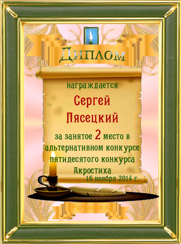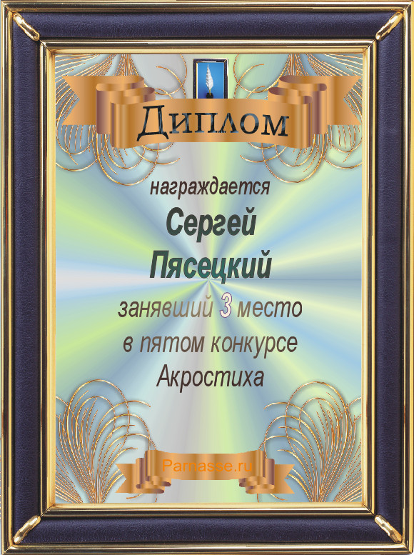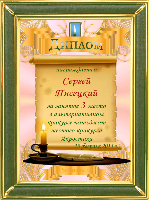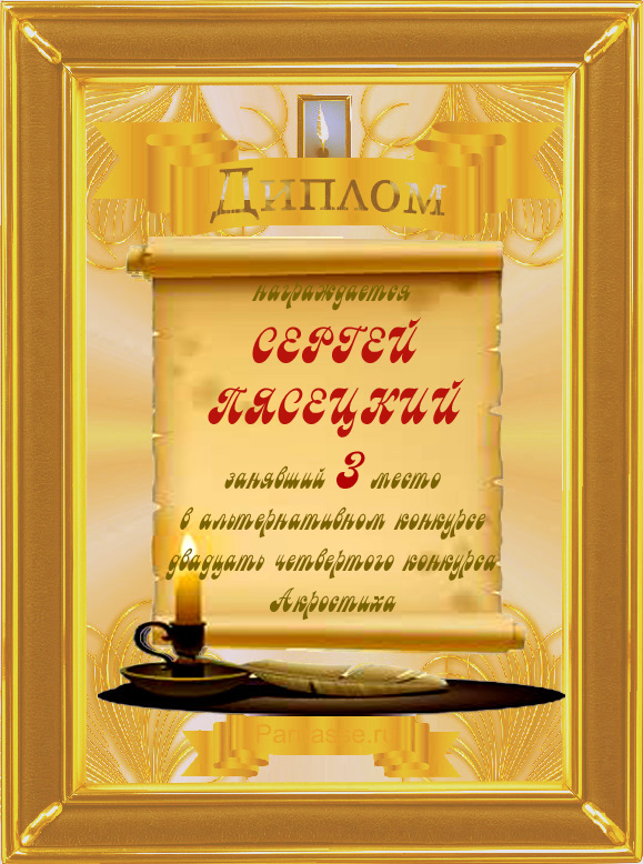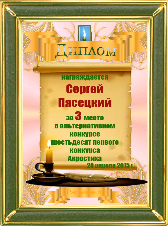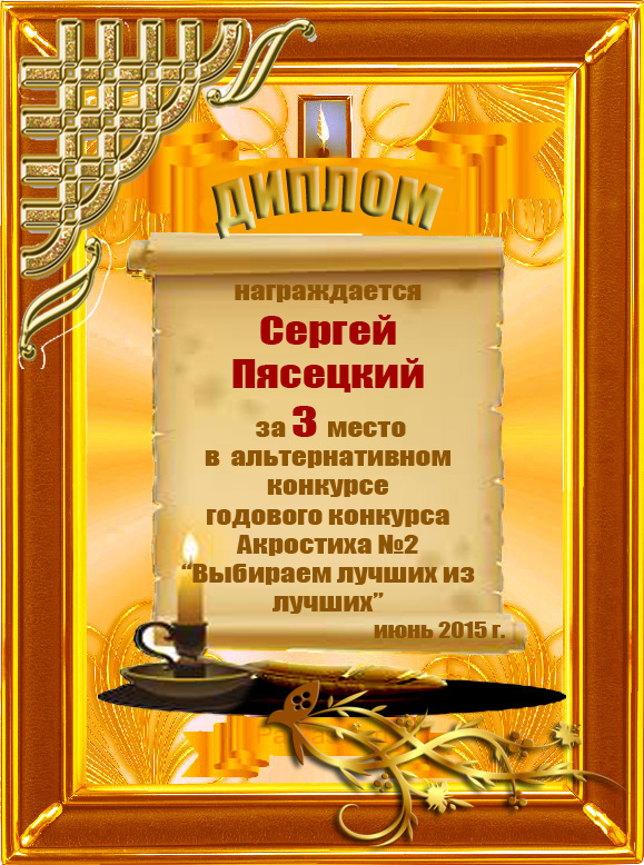 Диплом за 3 место во 2 годовом конкурсе Акростиха по итогам судейского голосования (Альтернатива)! ПОЗДРАВЛЯЮ!