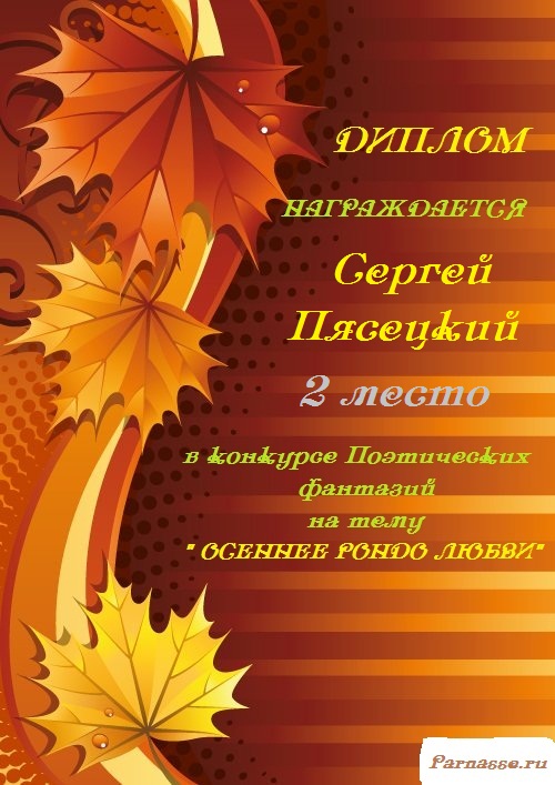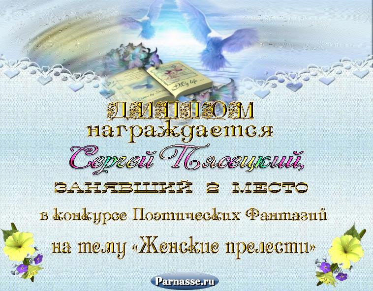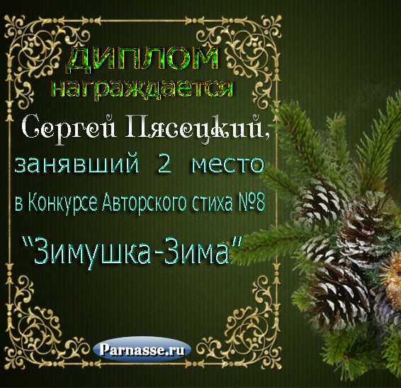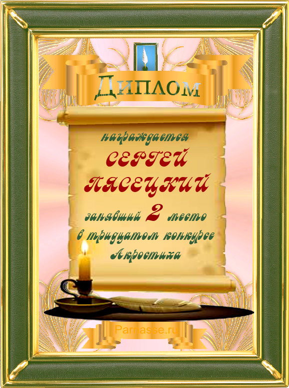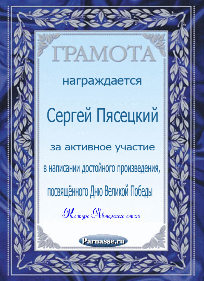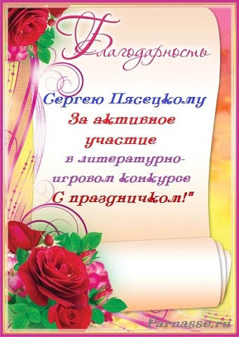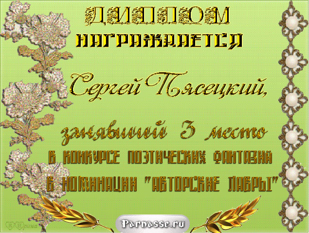 За неугасающую и неисчерпаемую творческую активность, постоянный контакт с Музой и признание сообществом "Парнасцев".От всей души желаем Вам, Сергей, здоровья, любви, успехов, благополучия, удачи и творческого вдохновения!