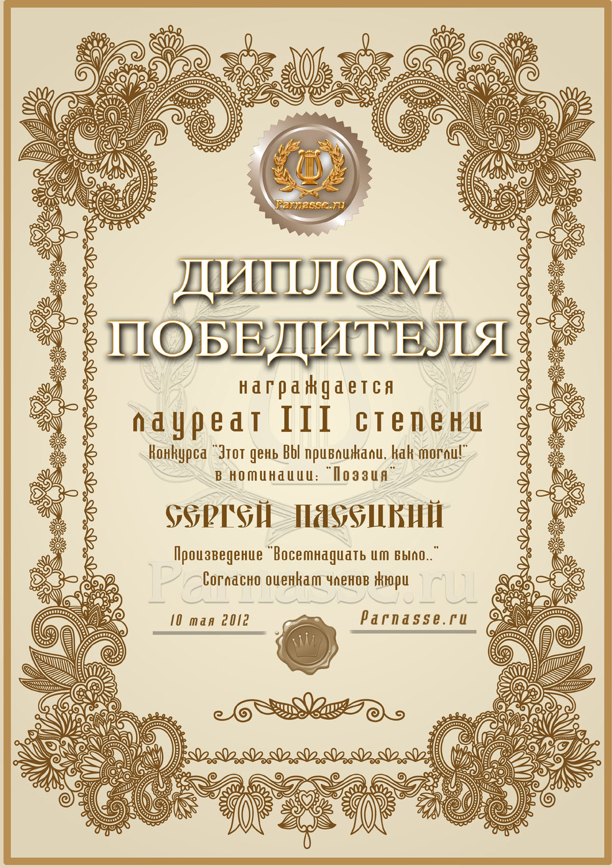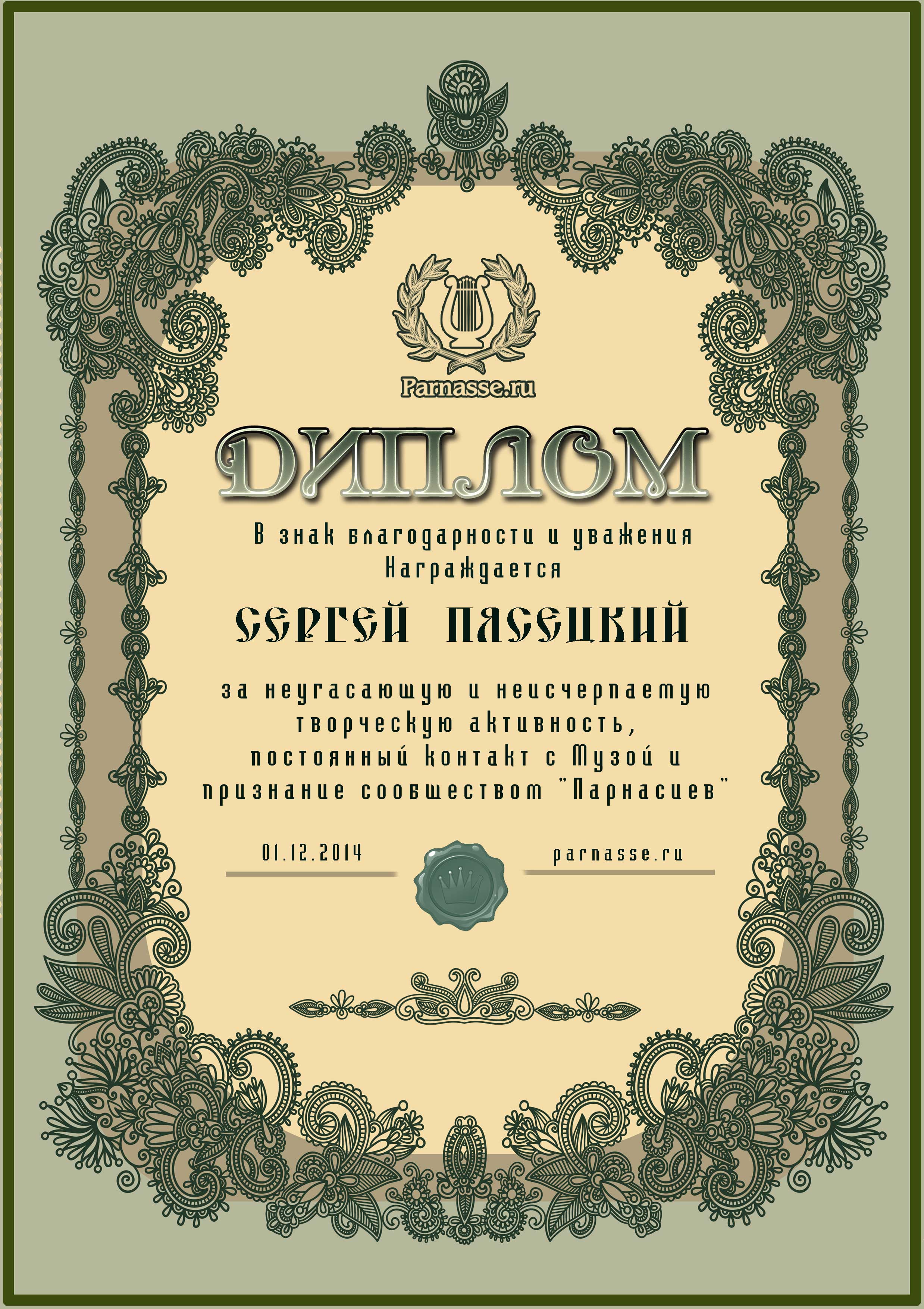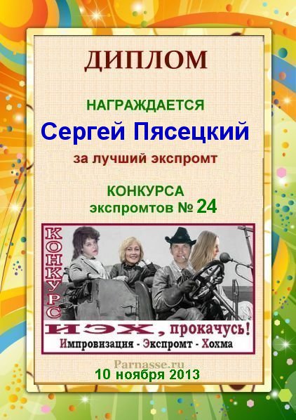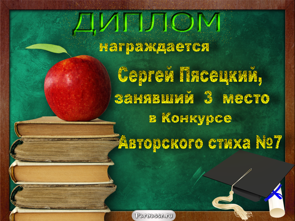 За неугасающую и неисчерпаемую творческую активность, постоянный контакт с Музой и признание сообществом "Парнасцев".От всей души желаем Вам, Сергей, здоровья, любви, успехов, благополучия, удачи и творческого вдохновения!