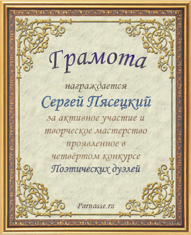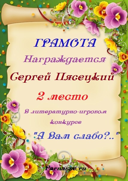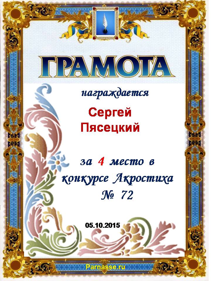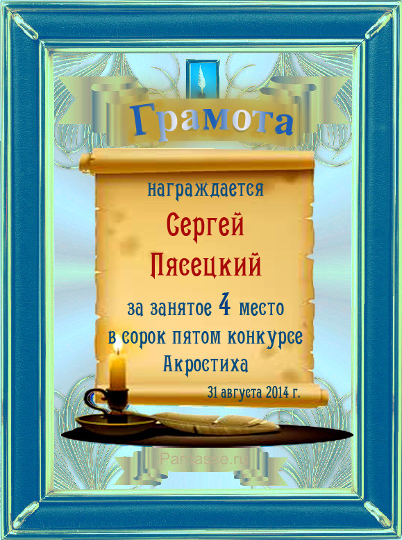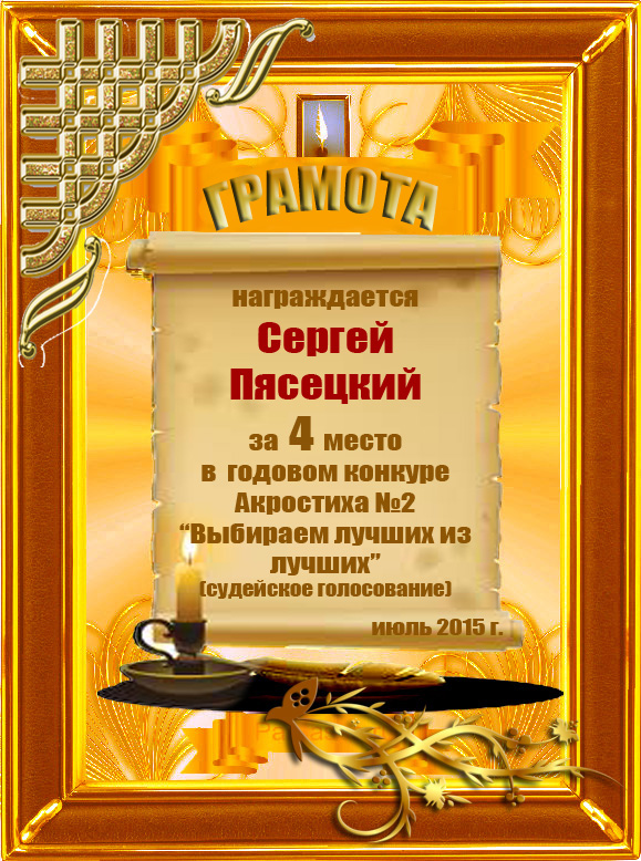 Грамота за 4 место во 2 годовом конкурсе Акростиха по итогам судейского голосования! ПОЗДРАВЛЯЮ!