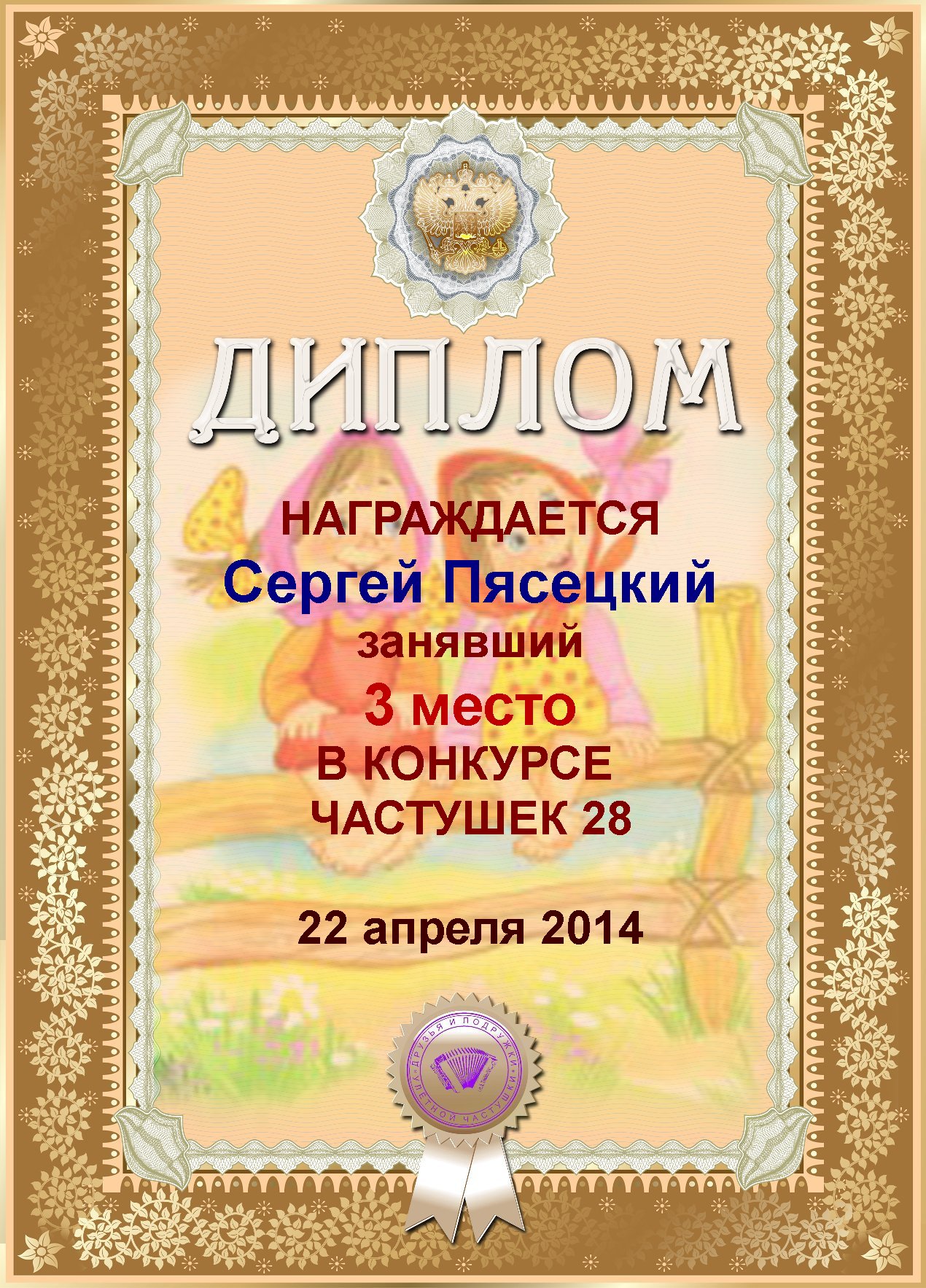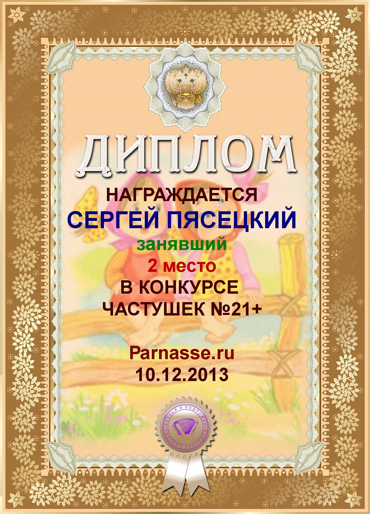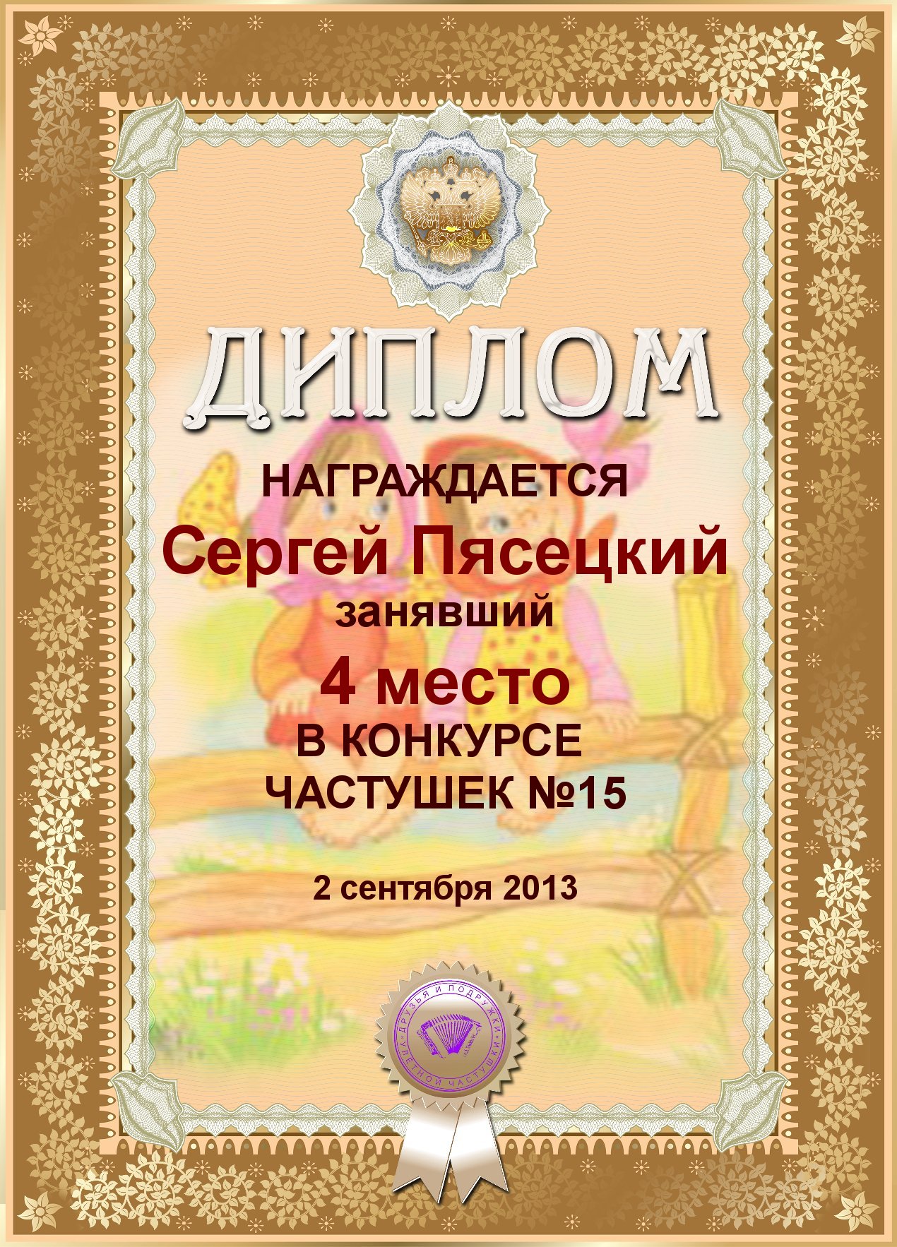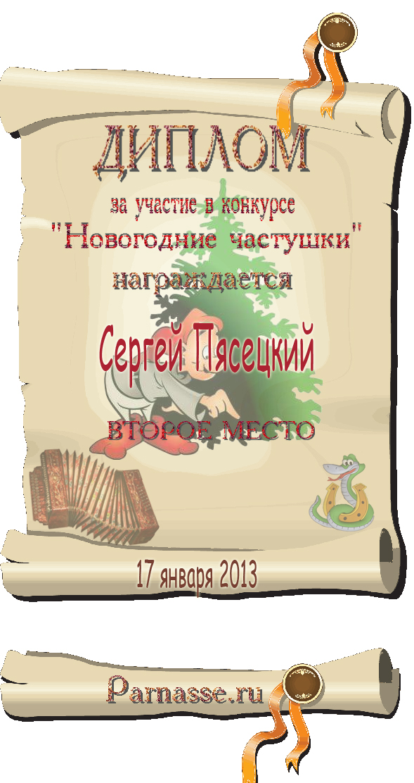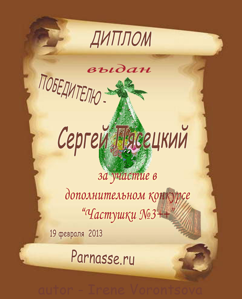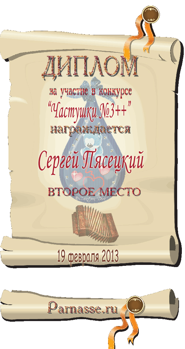СЕРГЕЙ, ПОЗДРАВЛЯЮ ВАС С ДВОЙНЫМ ПОЧЕТНЫМ - 4 МЕСТОМ В КОНКУРСЕ ЧАСТУШЕК №9++