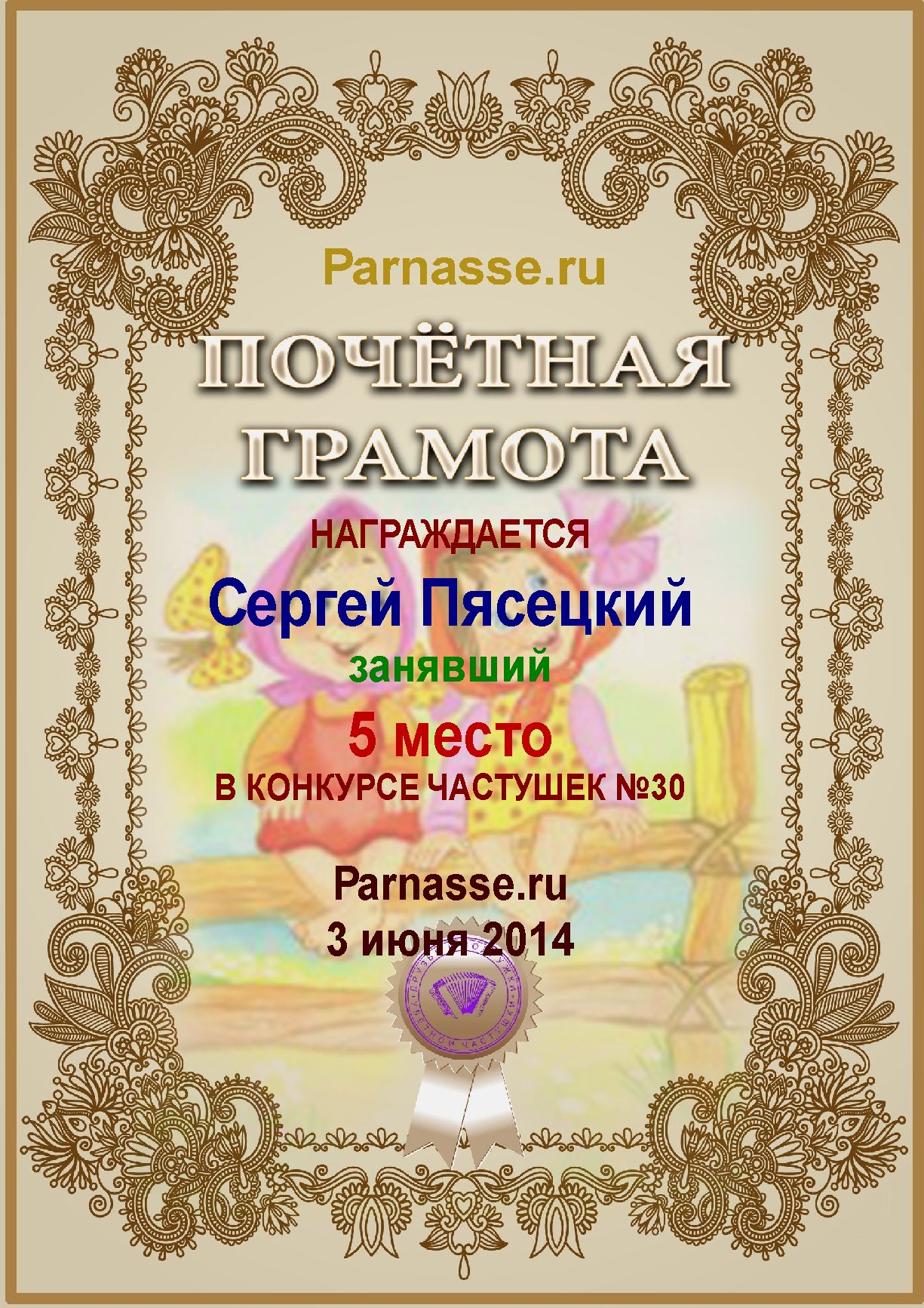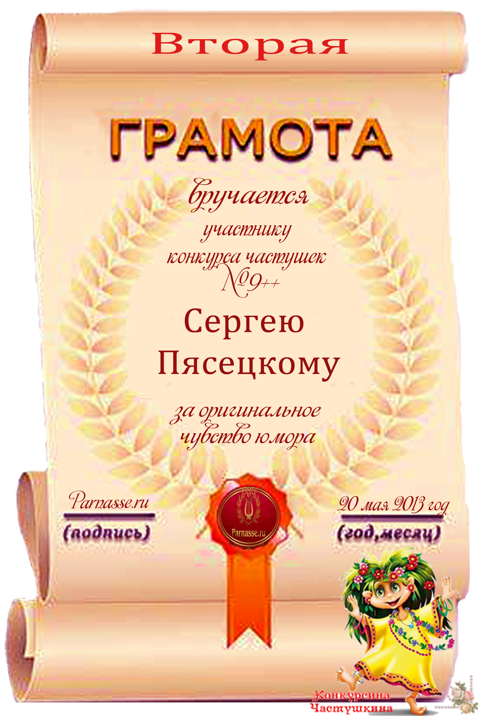 Похвальная грамота за 5 место в конкурсе лимериков № 41+ (9.09.2013 г.)